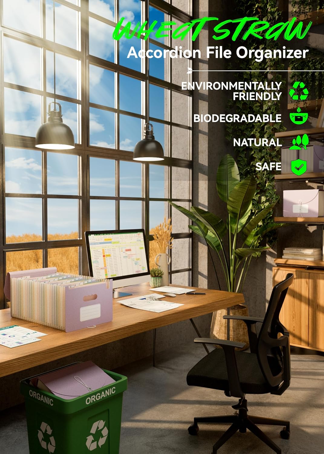 - Wheat Straw Material:Ecostash's Wheat Straw Accordion File Organizer are BPA-free, making them safer and healthier compared to plastic and paper file folders. Unlike plastic and paper hanging folders, wheat straw material is sourced from renewable agricultural waste, reducing dependence on petrochemical plastics and forest logging. This helps reduce greenhouse gas emissions, making a collective contribution to protecting the Earth's ecology.