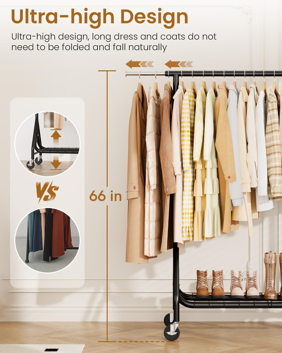 - ๐๐๐๐๐ฟ๐ ๐ผ๐๐ฟ ๐๐๐ผ๐ฝ๐๐ ๐พ๐๐๐๐๐๐๐พ๐๐๐๐: Our clothes rack adopts an innovative one-piece rod design, which ensures that the clothing rack are evenly supported, preventing sagging or bending. The triangle on the sides and dual U-shade rods on the bottom make the heavy duty clothing rack more stable and sturdy. The rolling rack can hold up to 450 pounds, so you can hang up heavy clothing, place luggage and more without worry.