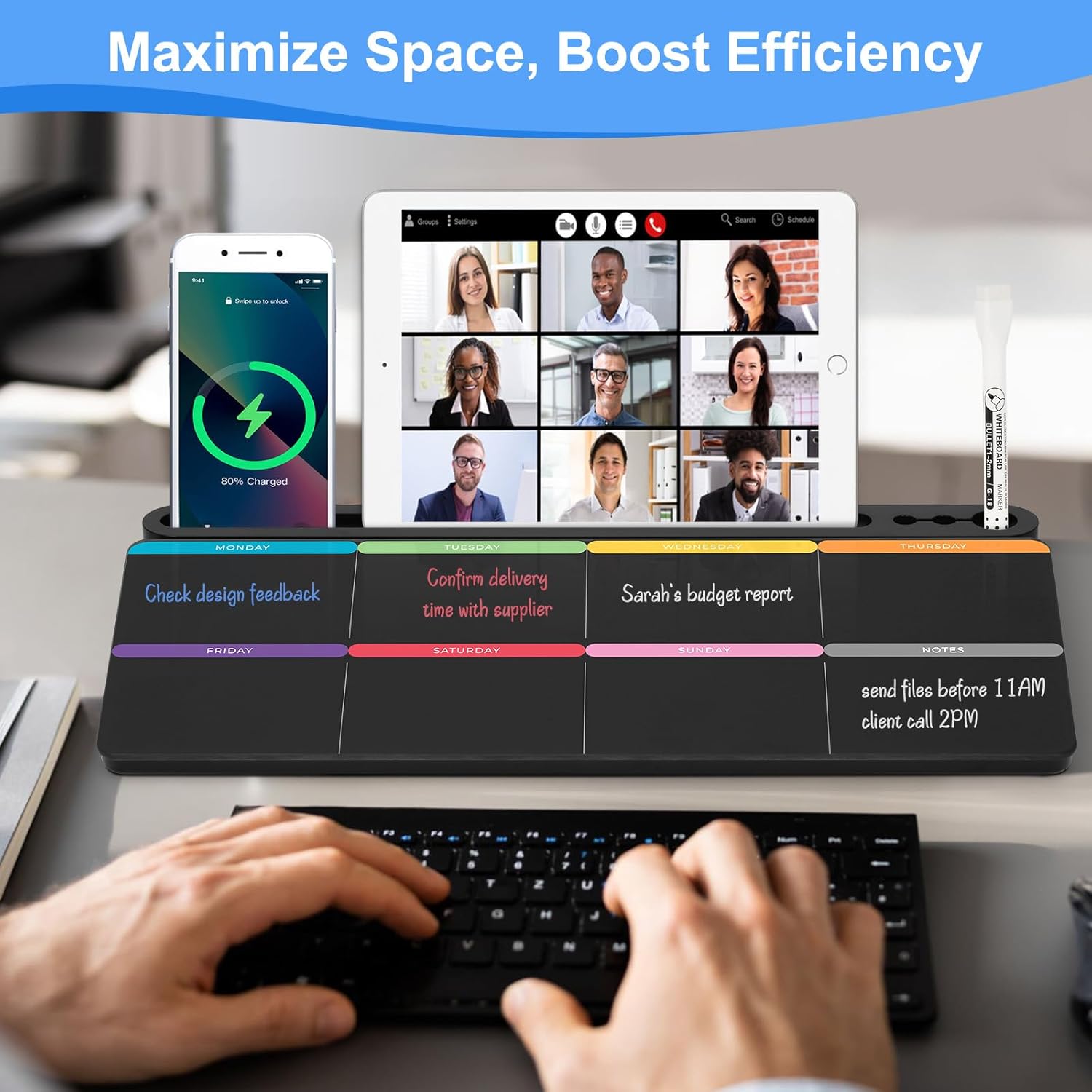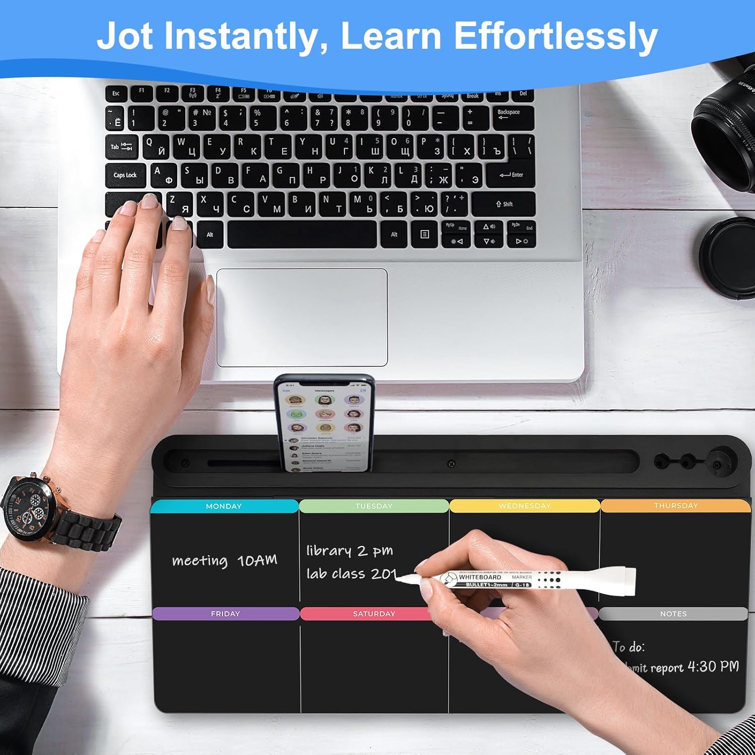 - Weekly Planner Whiteboard - Stay on top of your weekly schedule with ease using our desktop whiteboard. It features a colorful weekly grid with clearly defined sections for each day and notes. Crafted from tempered glass, it offers a smooth writing experience and effortless clean-up—no stains, no scratches. Perfect for organizing tasks, writing to-do lists, and taking quick reminders.
