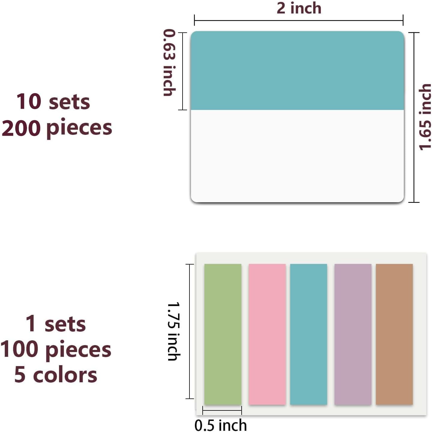 - 300pcs Book Tabs: 300 pcs 21 sets in total, 200 pieces 2 inch sticky tabs in 10 sets with different pastle colors,100 pieces 0.5 in tabs in 1sets, 20 pieces each color