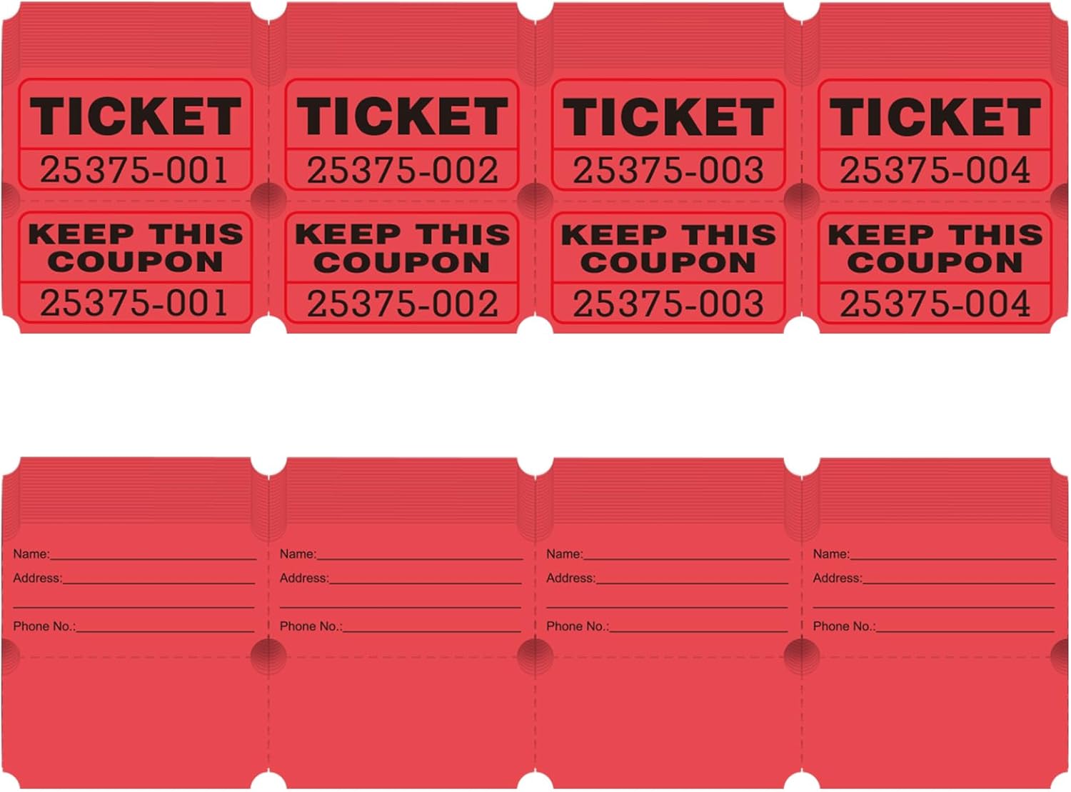 - The red colored raffle tickets are consecutively numbered and perforated, making it easy to tear off multiple tickets at once. The large numbers are easy to read and there are duplicate numbers for tracking purposes.