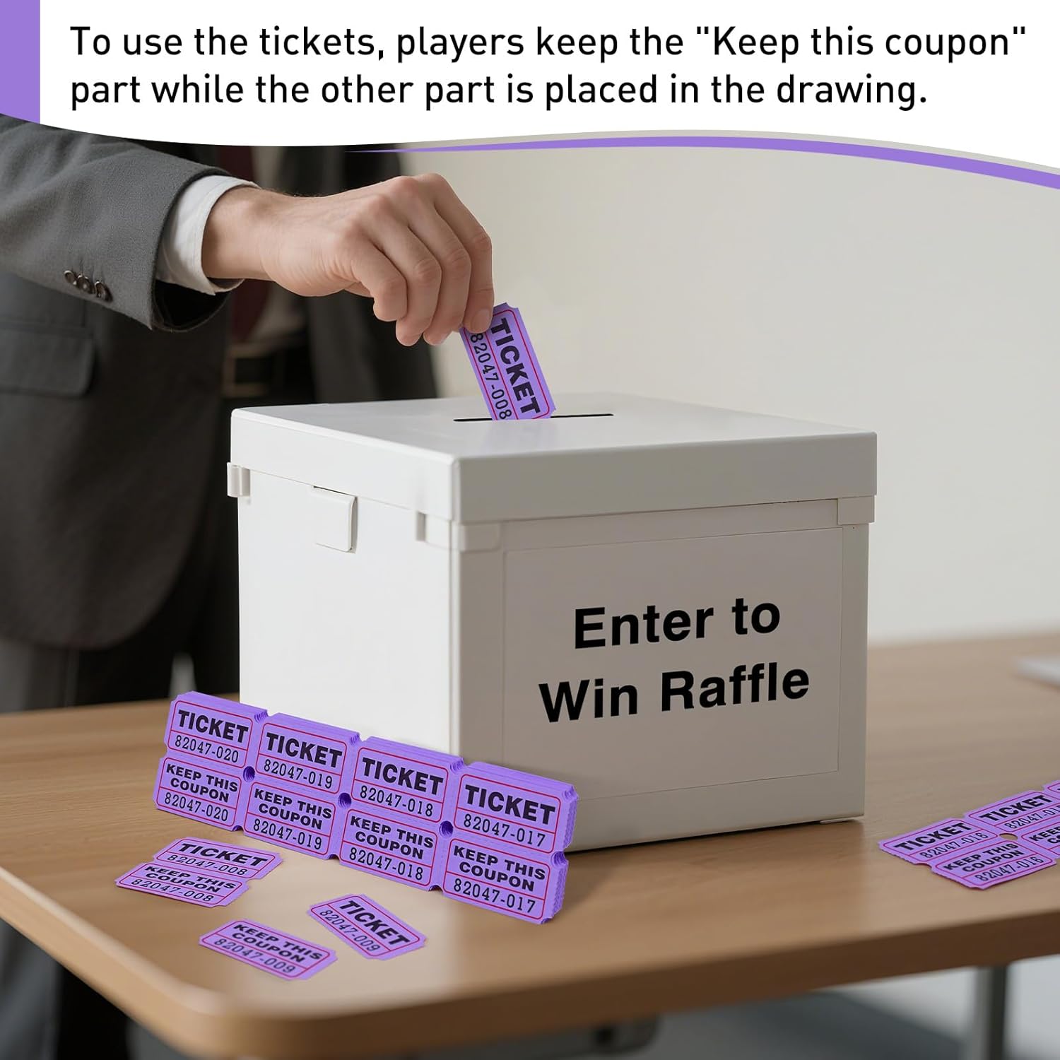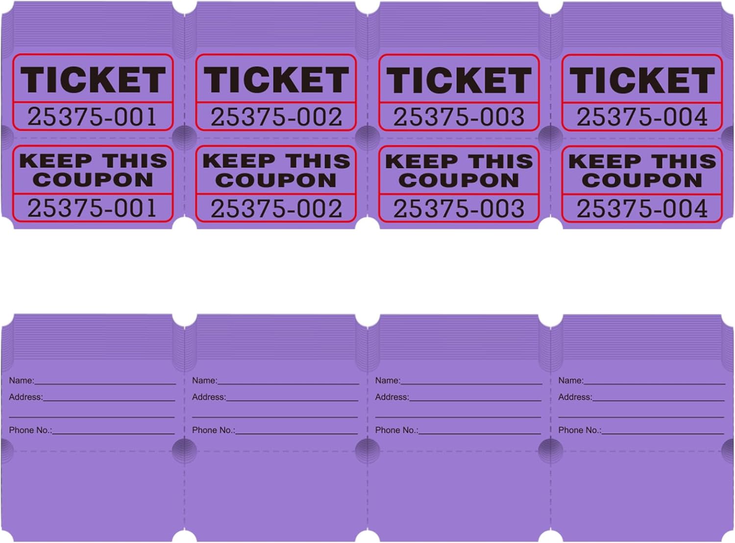 - The purple colored raffle tickets are consecutively numbered and perforated, making it easy to tear off multiple tickets at once. The large numbers are easy to read and there are duplicate numbers for tracking purposes.
