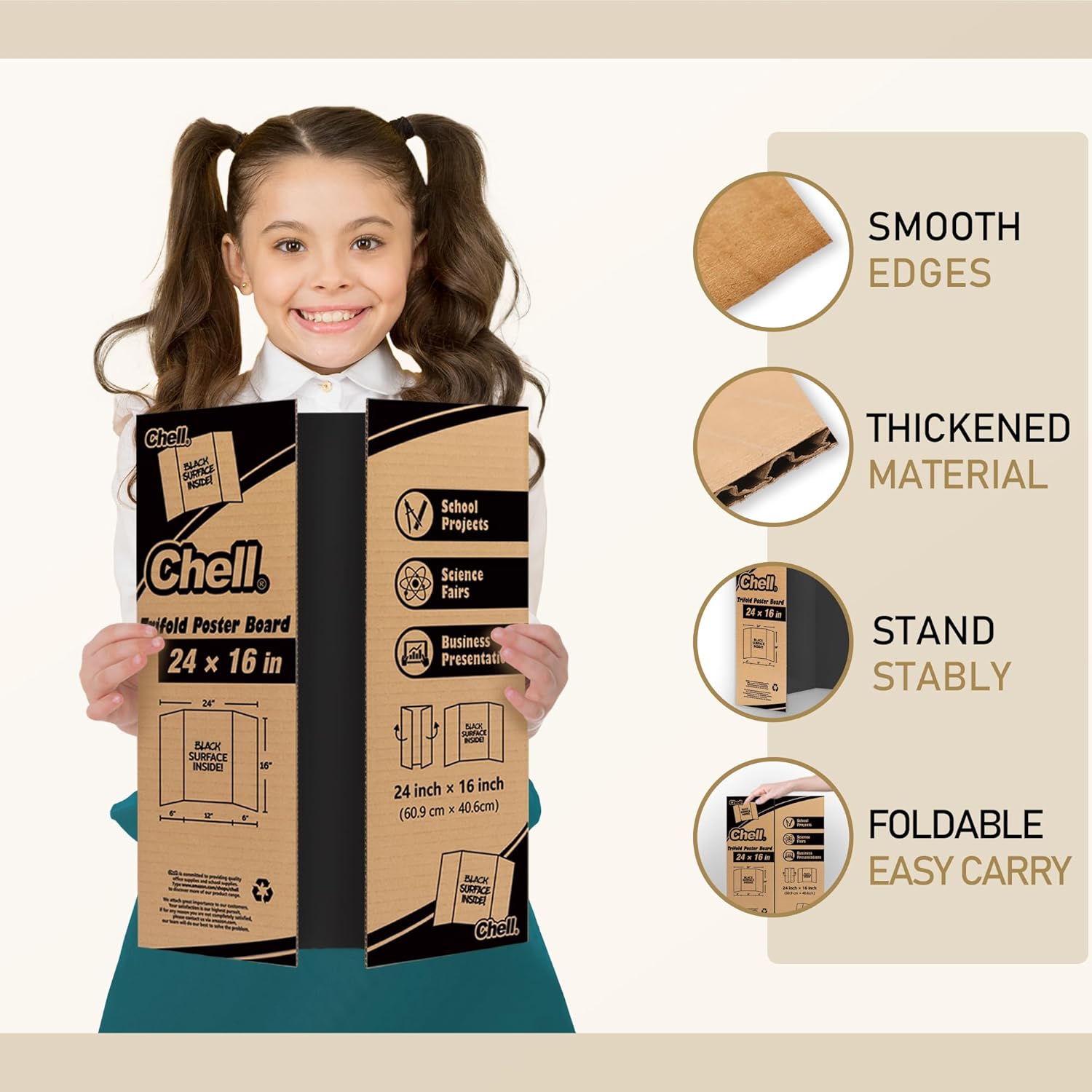 Chell Mini Size Trifold Poster Board, 16" x 24", Small Corrugated Project Boards, Black, 2 Pack