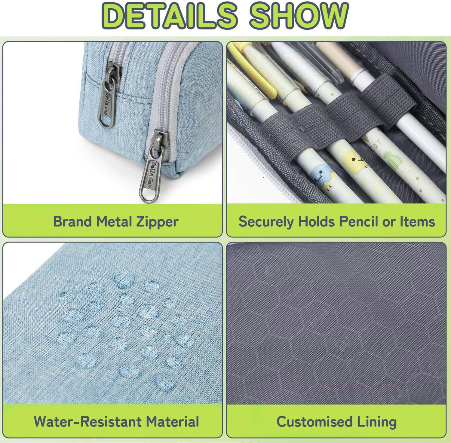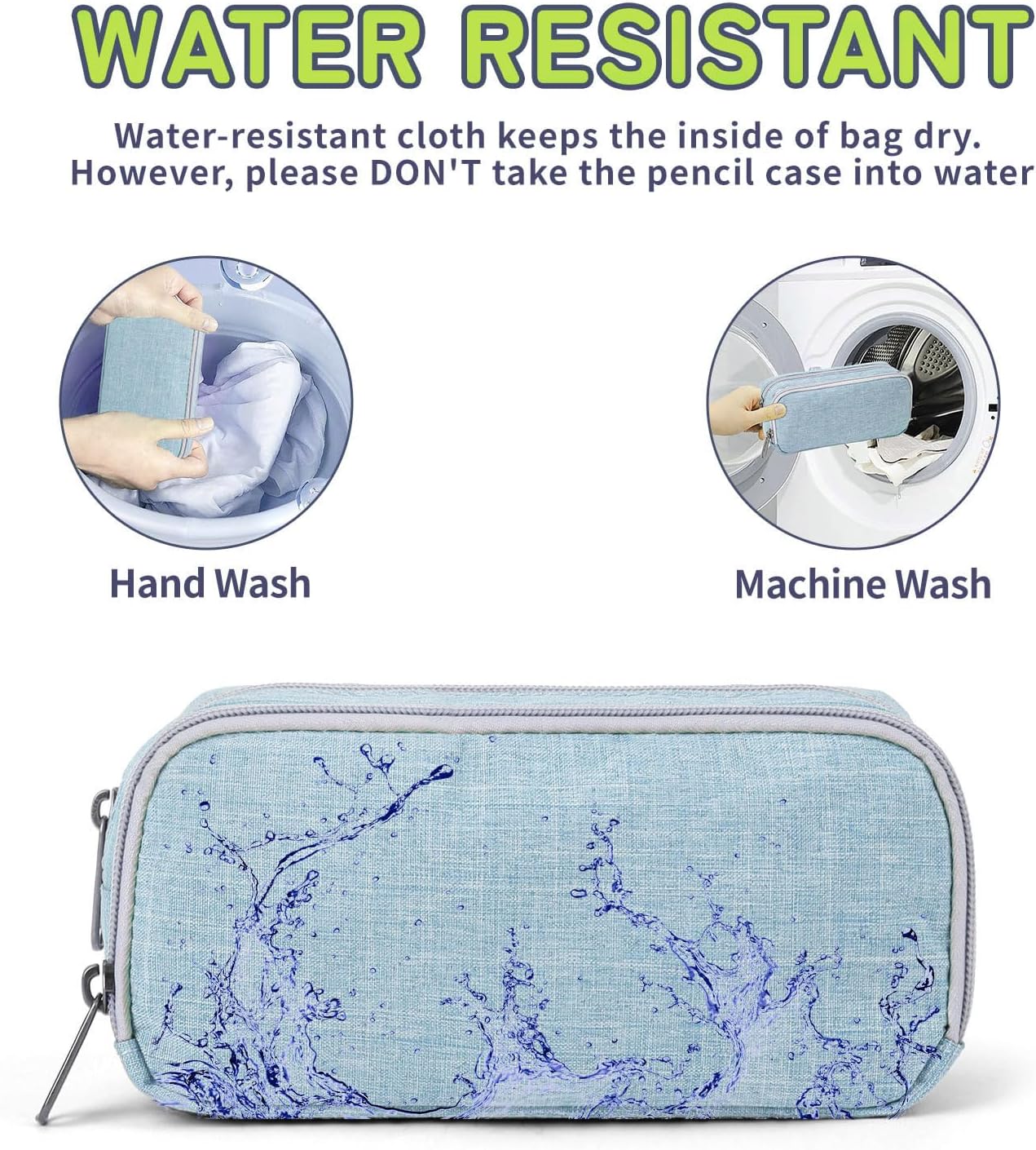 - Material & Accessories:The light blue pencil case is made of hard-wearing lightweight polyester material, it's water-resisitant, tear-resisitant and washable.But you cannot put it in water, because the zipper are not waterproof.The brand metal zipper puller and smooth zipper provide longer service life. Attention:Case only, pencils not included