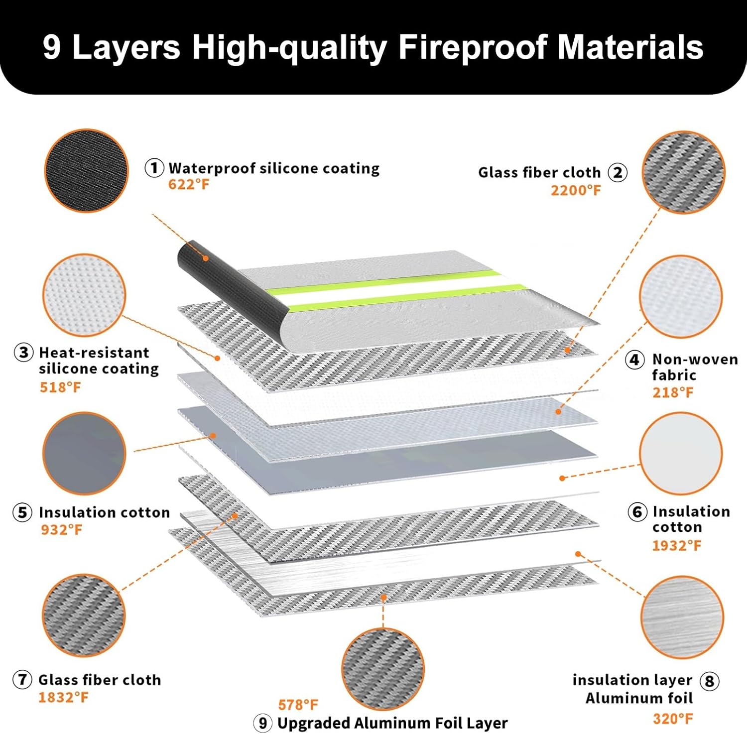 - 🧯【Heat Attenuation Structure】This fireproof bag uses 9 layers of heat attenuation materials such as glass fiber cloth, insulation cotton, aluminum foil, etc. from the inside to the outside. The unique nesting design allows the fireproof bag to have independent space between the material layers, so that the heat transfer from different non-direct contact media is continuously weakened, preventing heat transfer, giving you enough time to save your valuables from the fire.