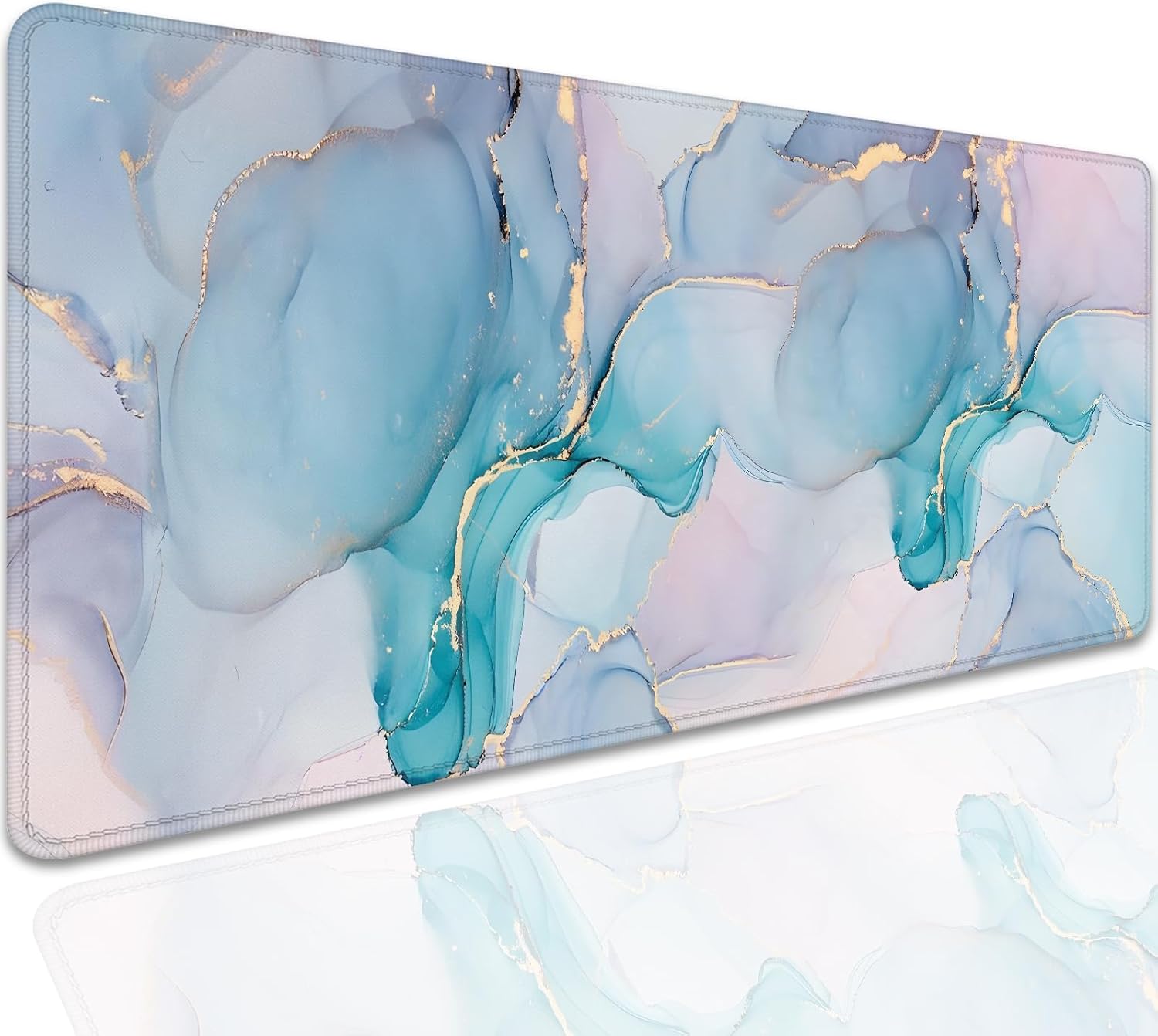 Cyan Blue Marble Desk Pad Mouse Pad,Large XL Mouse Mat with Stitched Edges,Non-Slip Rubber Base Mousepad for Office PC Keyboard Laptop and Home Work Desk Mat(27.5X11.8 in)