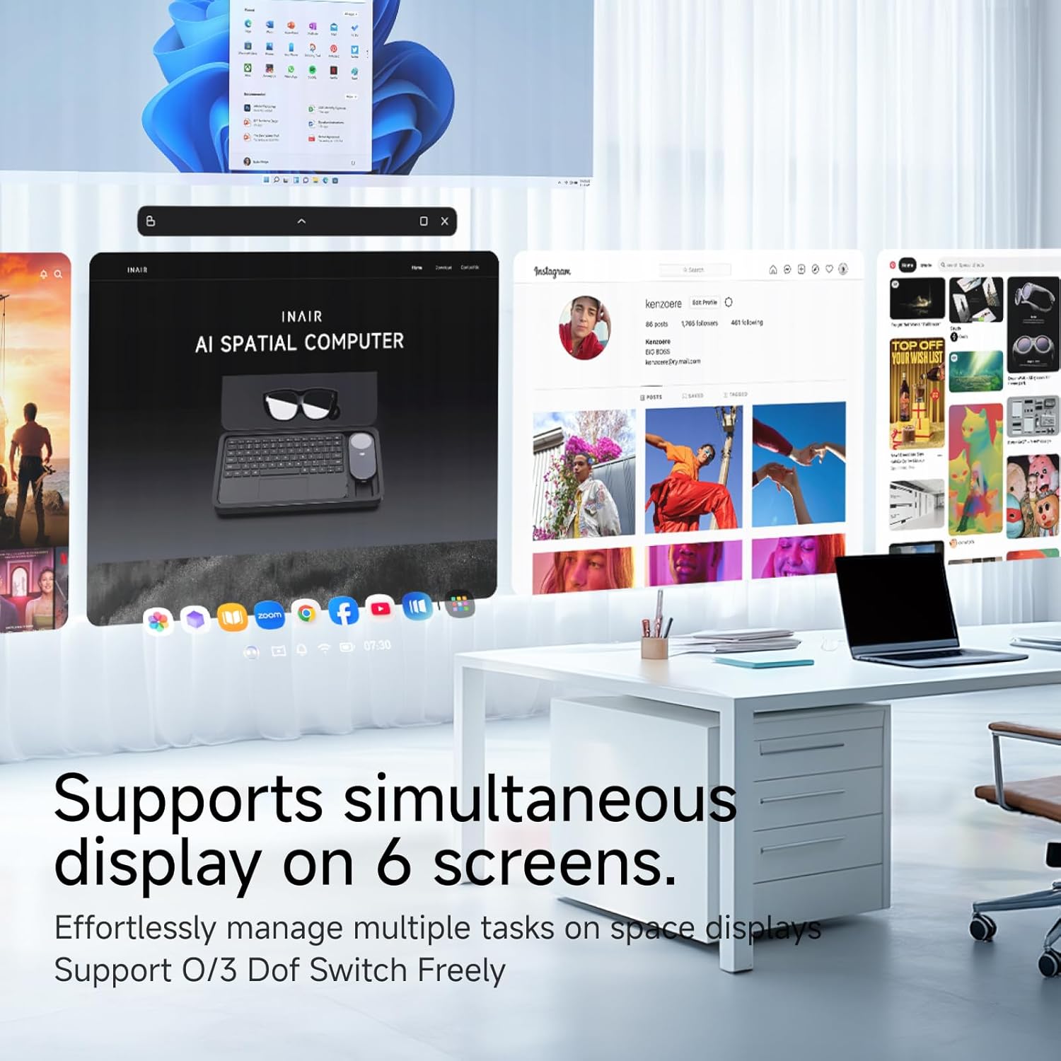 - Native 3D Spatial Operating System: The built-in 3D spatial OS supports two display modes: 3DoF Hover Mode keeps windows fixed in space for stationary viewing. 0DoF Follow Mode lets windows move naturally with the user. Up to six floating windows can be resized, repositioned, or rotated between portrait and landscape views.