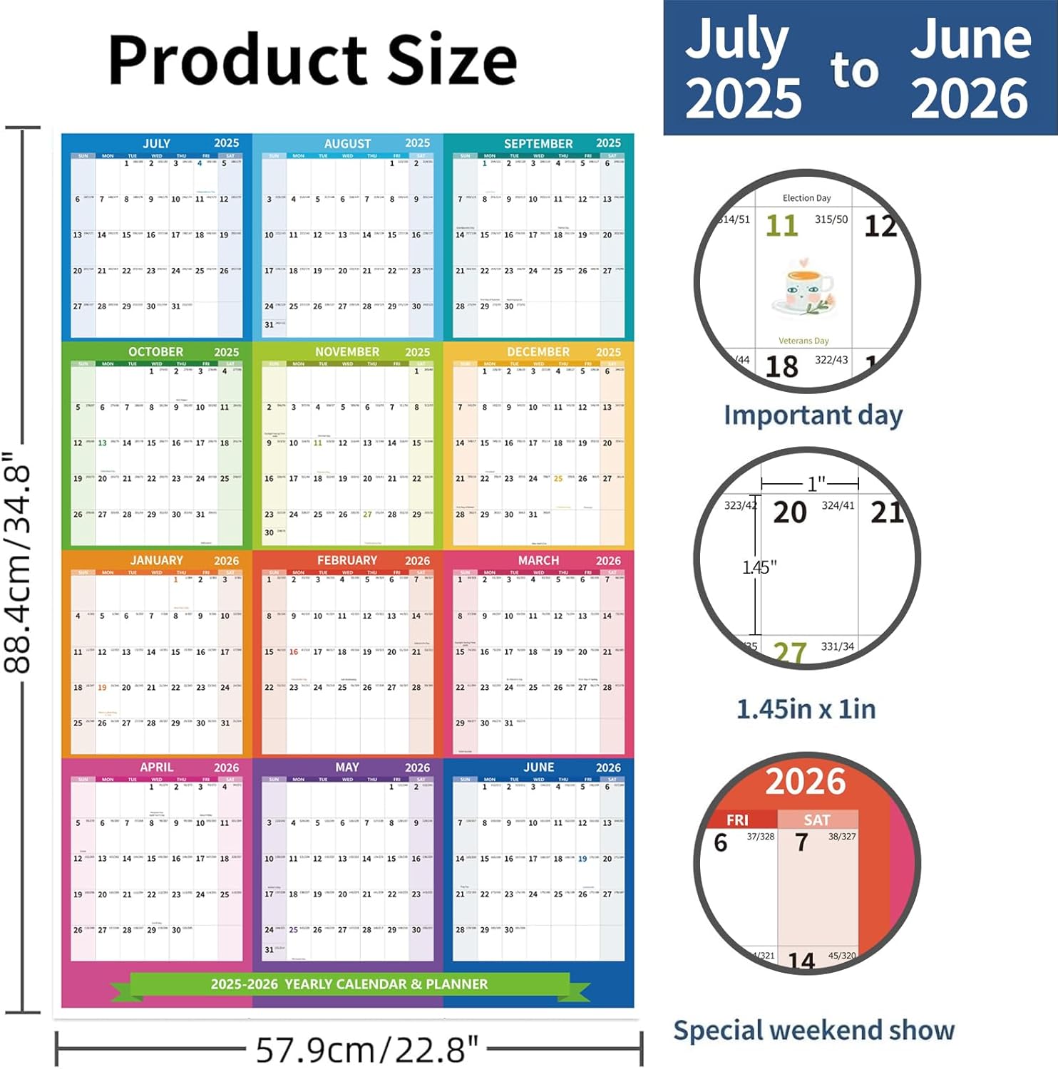 - Set: You will receive a 2025-2026 wall calendar with 12 months from July 2025 to June 2026, the holidays and festivals in the different months are marked so you can plan your year at a glance.