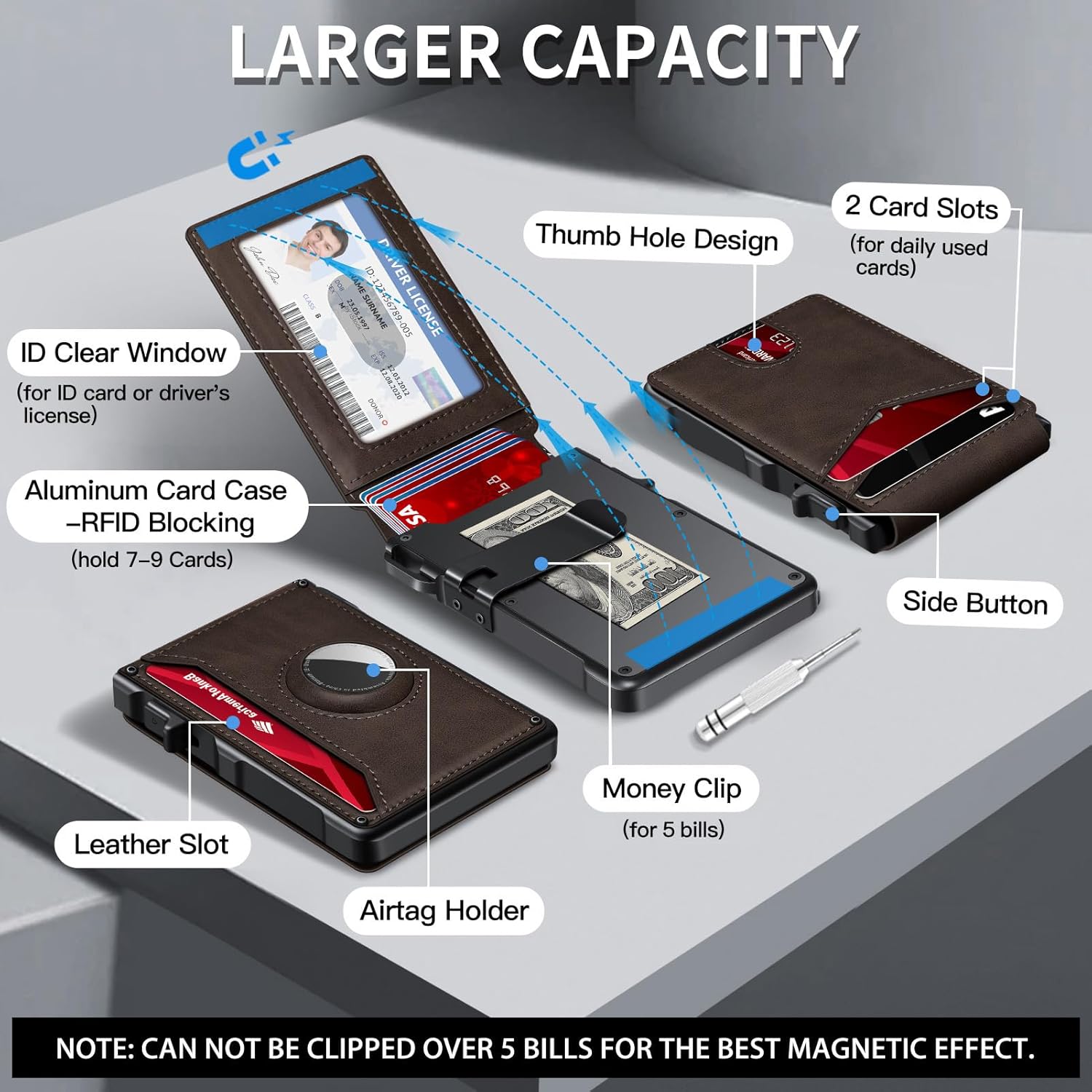 - MINIMALIST BUT LARGE CAPACITY - Our minimalist wallet for men with air tag holder fits effortlessly in pockets without bulk, yet holds 12+ cards, cash and AirTag securely. A money clip on the inside of the card holder helps you store cash(For the best magnetic effect, please DO NOT clip over 5 bills to the money click inside).