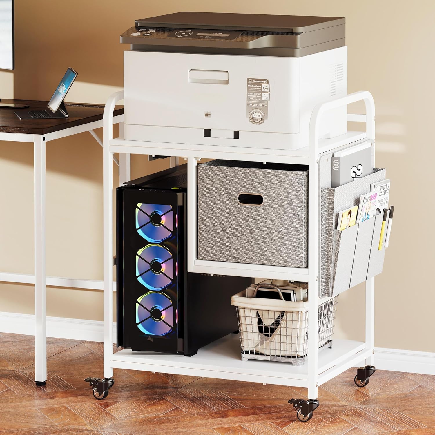 3 Tier Heavy Duty Printer Stand with Storage, Computer Tower Stand with Industrial Wheels & Drawer, Large Mobile Printer Table for Home Office Organization (Pearl White)