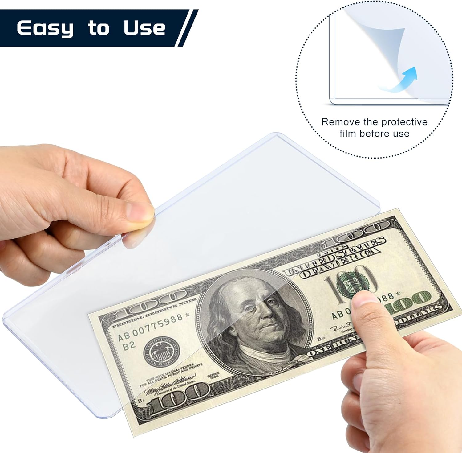 - Practical Size: The external dimensions of clear dollar bill protector is 6.85 × 2.91 inches (internal dimensions: 6.57 x 2.8 inches), which can be perfectly fit to most banknotes