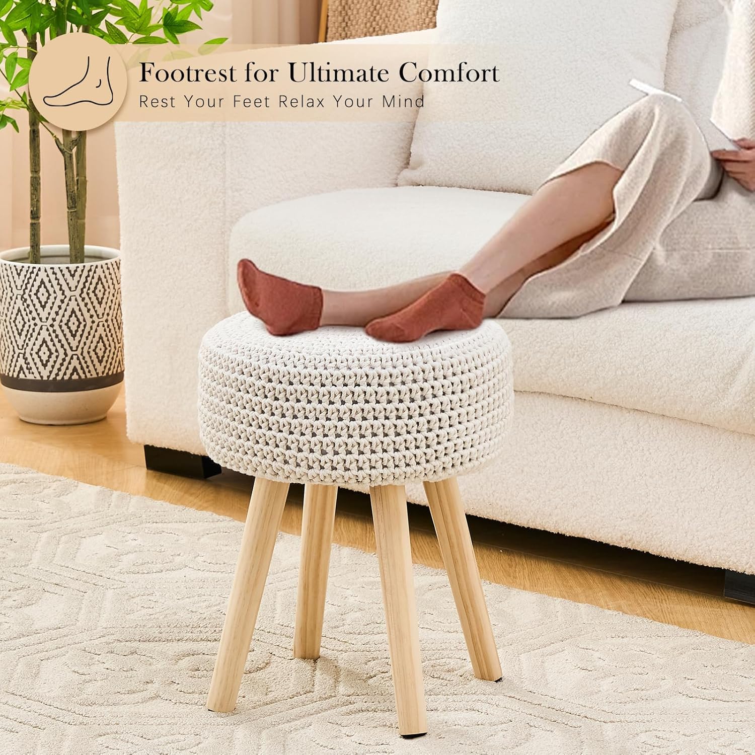 - 【Comfortable and Sturdy Ottoman】This ottoman features a high-resilience foam cushion wrapped in premium knitted cotton fabric, delivering a soft and cozy seating experience. Supported by sturdy wooden legs, it offers exceptional stability and durability, with a weight capacity of up to 350 lbs. Designed for both comfort and longevity, it’s a perfect addition to any living space.