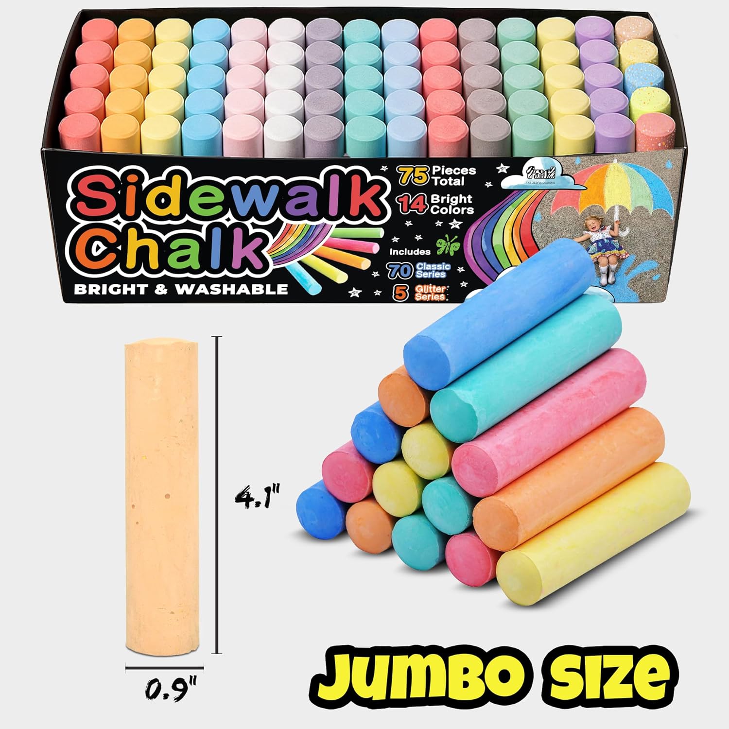 - Vibrant Color Variety: Unleash creativity with 75 jumbo sidewalk chalk pieces in 14 vivid colors, including 5 glitter chalks for a magical touch on sidewalks, streets, driveways, playgrounds, and chalkboards.