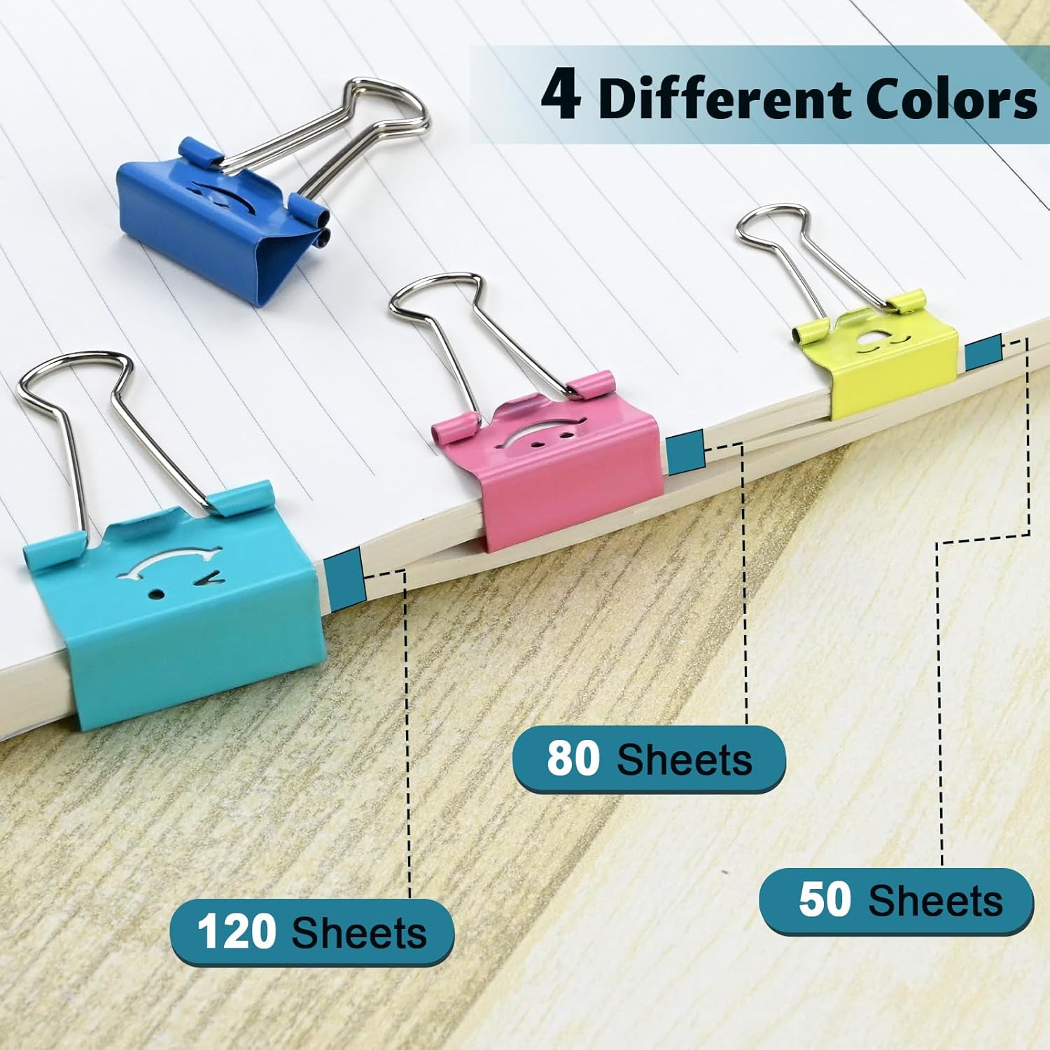 100 Pack Binder Clips Paper Clamps Assorted Sizes and Colors Cute Binder Clips with Smiling Face Metal Paper Clamps for Office, School