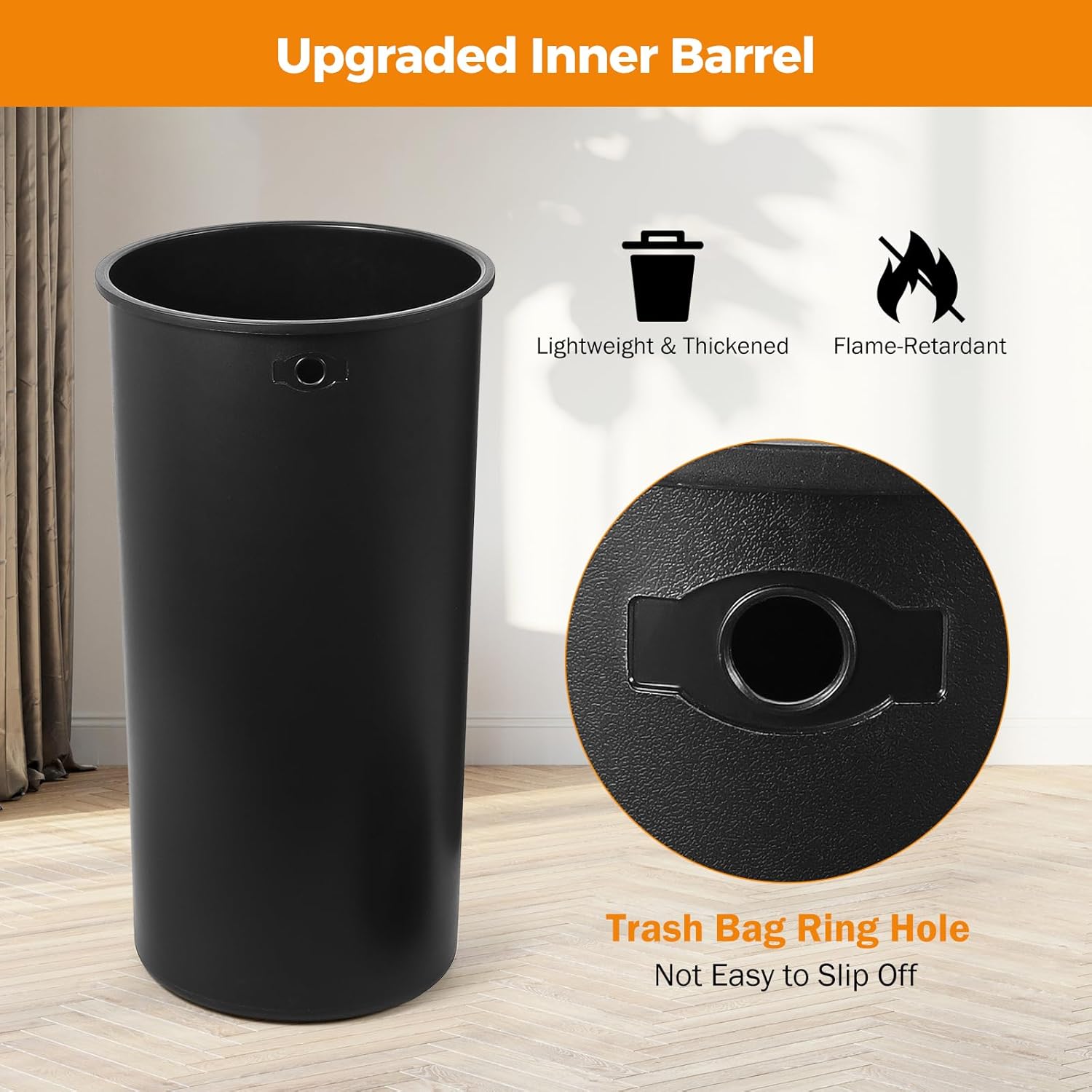 - **Removable Inner Bin & Easy Lift-Off Lid** The BEAMNOVA commercial heavy-duty trash can includes a detachable inner bin for easy cleaning and maintenance. The lid lifts off smoothly, allowing for quick and hassle-free bag changes while keeping the bag discreetly hidden for a tidy look.