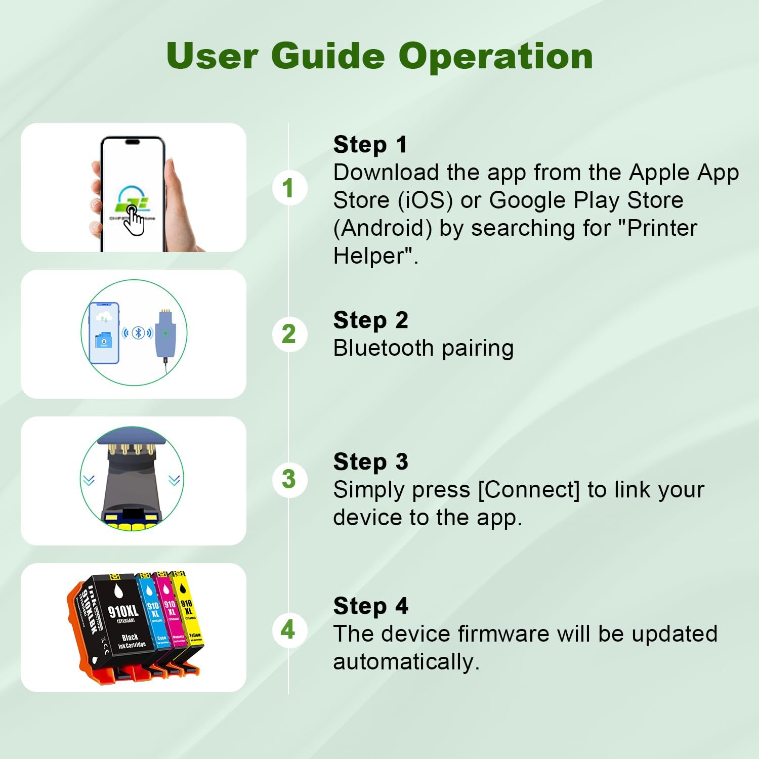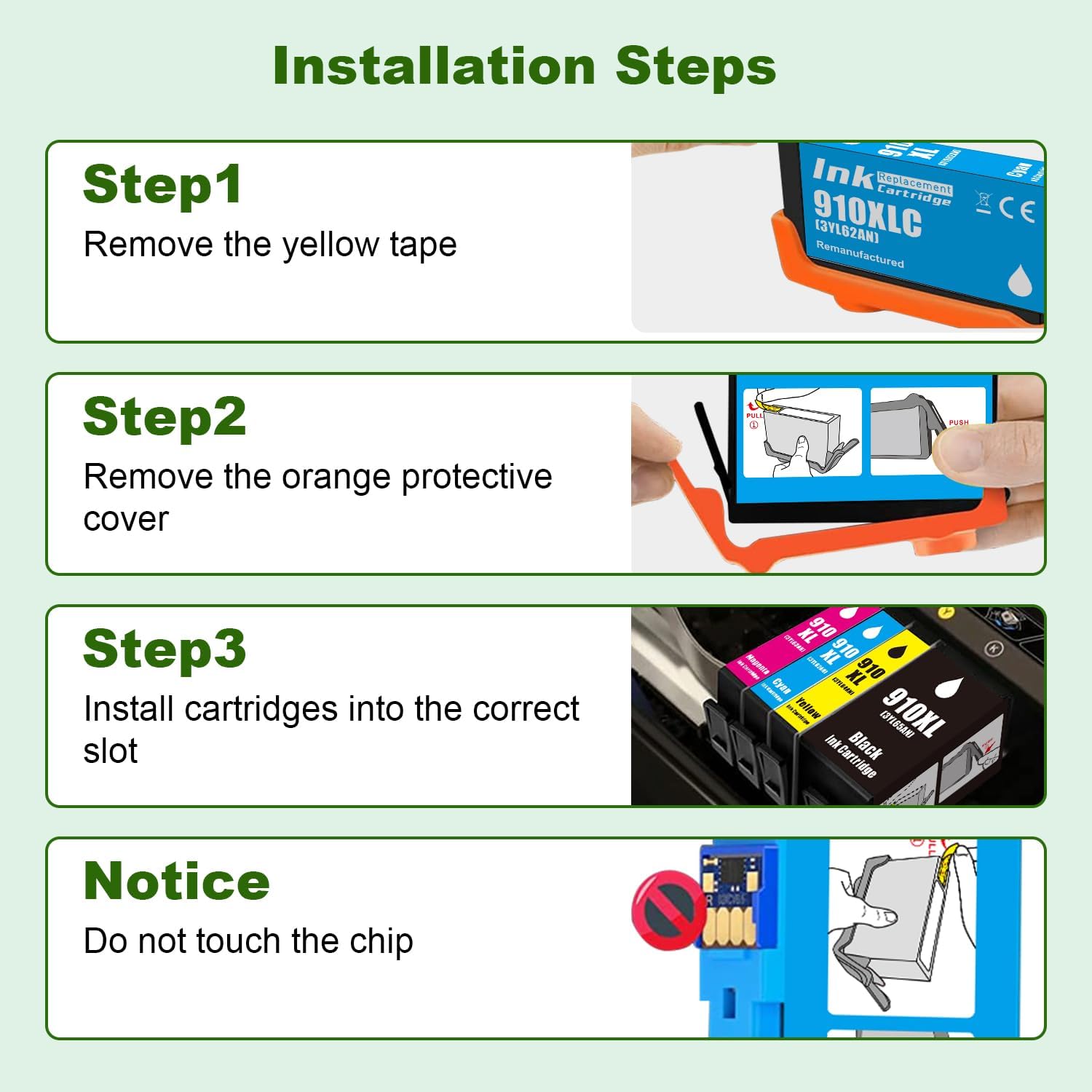 - Package Includes: 1 × 910XL Black Ink Cartridge, 1 × 910XL Cyan Ink Cartridge, 1 × 910XL Magenta Ink Cartridge, 1 × 910XL Yellow Ink Cartridge, and 1 × Upgrade Device (Note: Non OEM ink cartridges )