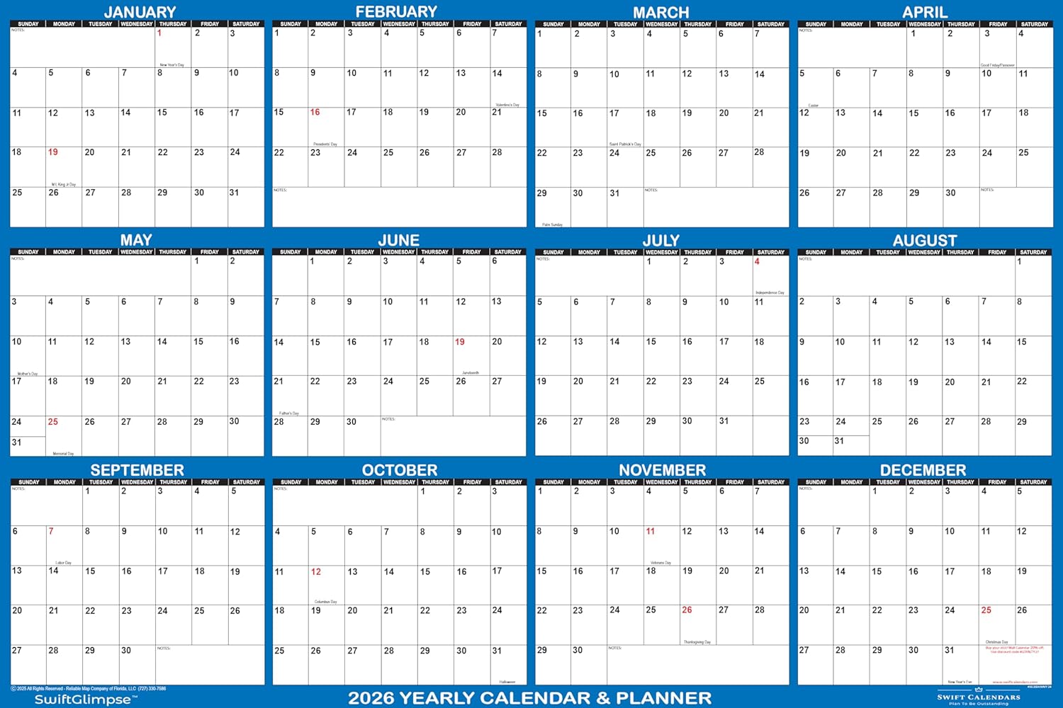 - LARGE 2026 CALENDAR BLOCKS: Each Wall Calendar features large blocks for scheduling and notes. Vertical side blocks are 2" x 1.75" - Horizontal side blocks are 2" x 2". Bold and large print with bright white background allows for easier viewing and reading at-a-glance.