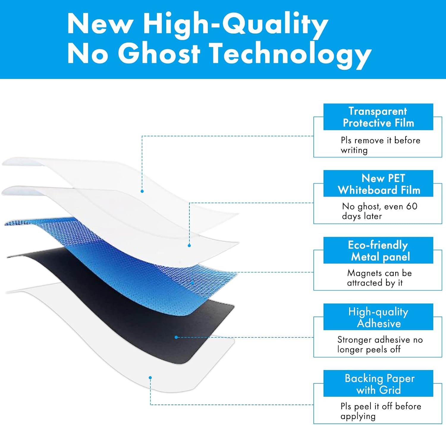 - NO GHOST – Upgraded the stain-resistant technology, even if leave drawing on it for 60 days, they still erase with ease. NOTE: pls REMOVE the TRANSPARENT PROTECTIVE FILM on the whiteboard before using it.