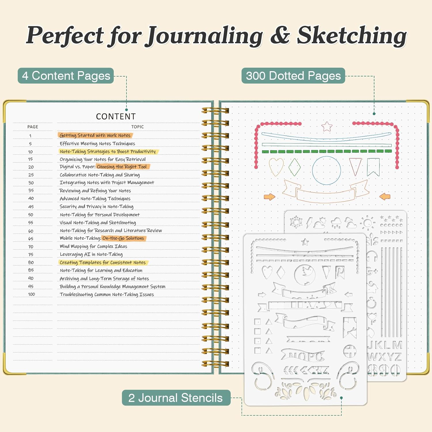 Bullet Dotted Journal Spiral Notebook, 300 Pages Leather Notebooks with Contens, 120 GSM Thick No Bleed Through Paper Journals, A5 Dot Grid Notebook for Women Men School Work Writing, 5.5" x 8", Green