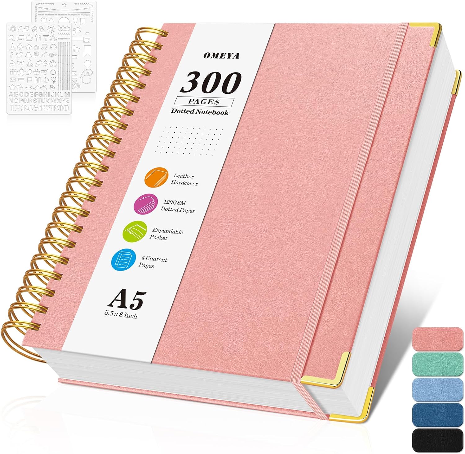 Bullet Dotted Journal Spiral Notebook, 300 Pages Leather Notebooks with Contens, 120 GSM Thick No Bleed Through Paper Journals, A5 Dot Grid Notebook for Women Men School Work Writing, 5.5" x 8", Pink