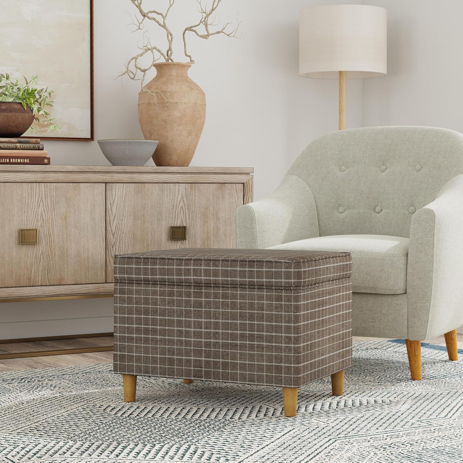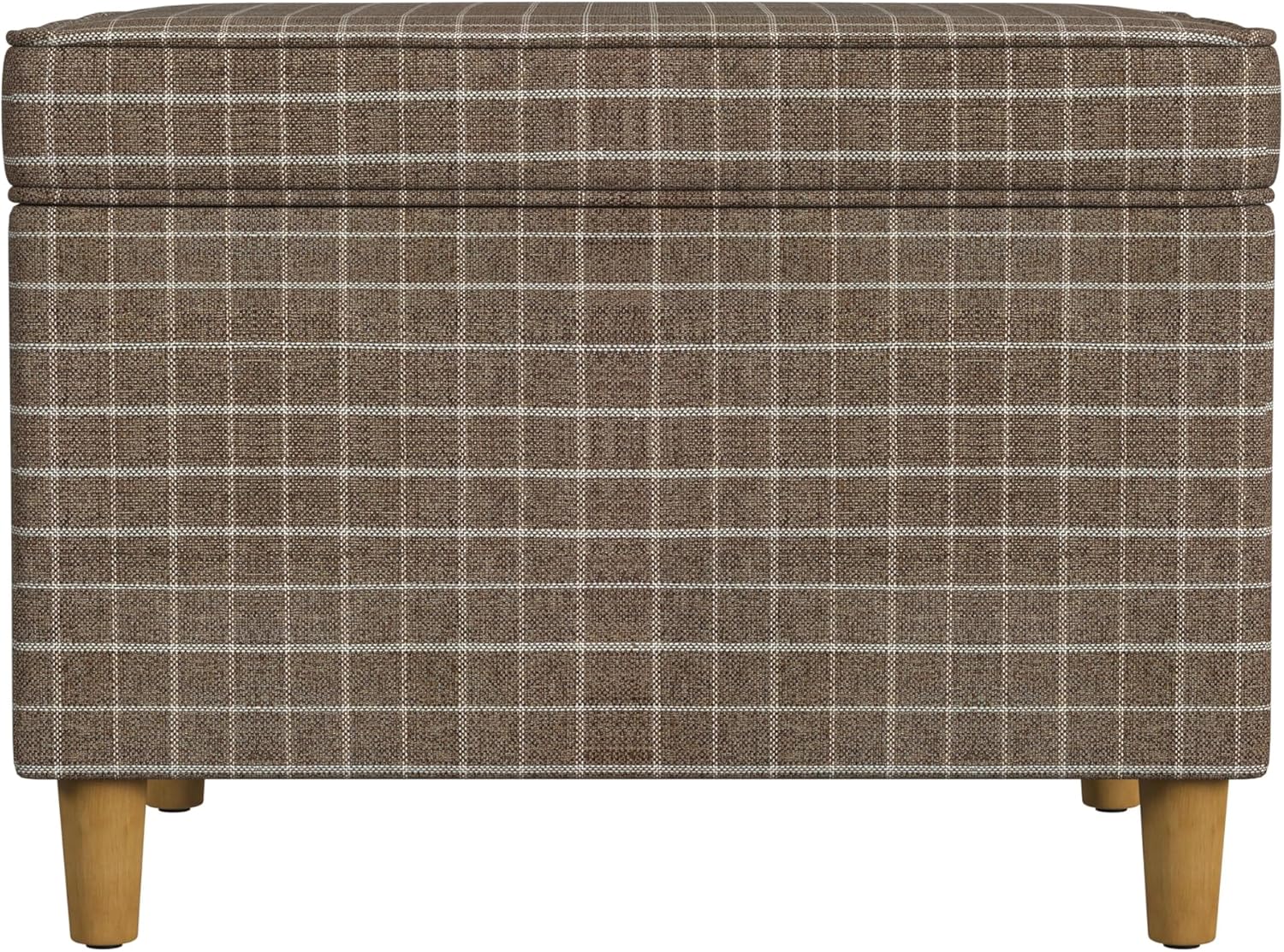 - Timeless & Functional Design – This Spatial Order Rectangular Storage Ottoman features a classic brown windowpane plaid fabric, paired with honey oak-finish wooden legs, bringing a warm and sophisticated look to any space.