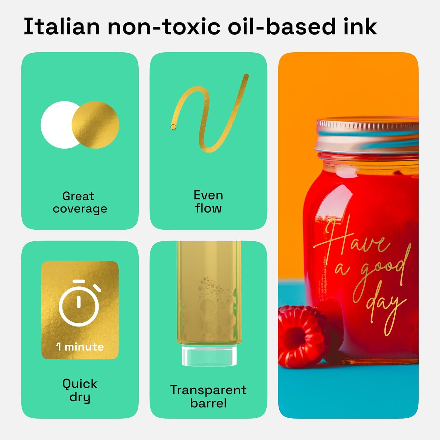 - Multiple Surfaces: Use these gold oil paint pens as oil markers for plastic and glass or as oil based fabric markers for clothes. Each oil based pen is water-resistant. They’re also good for leather, vinyl, or epoxy resin. And the nibs are solid, even on rocks!