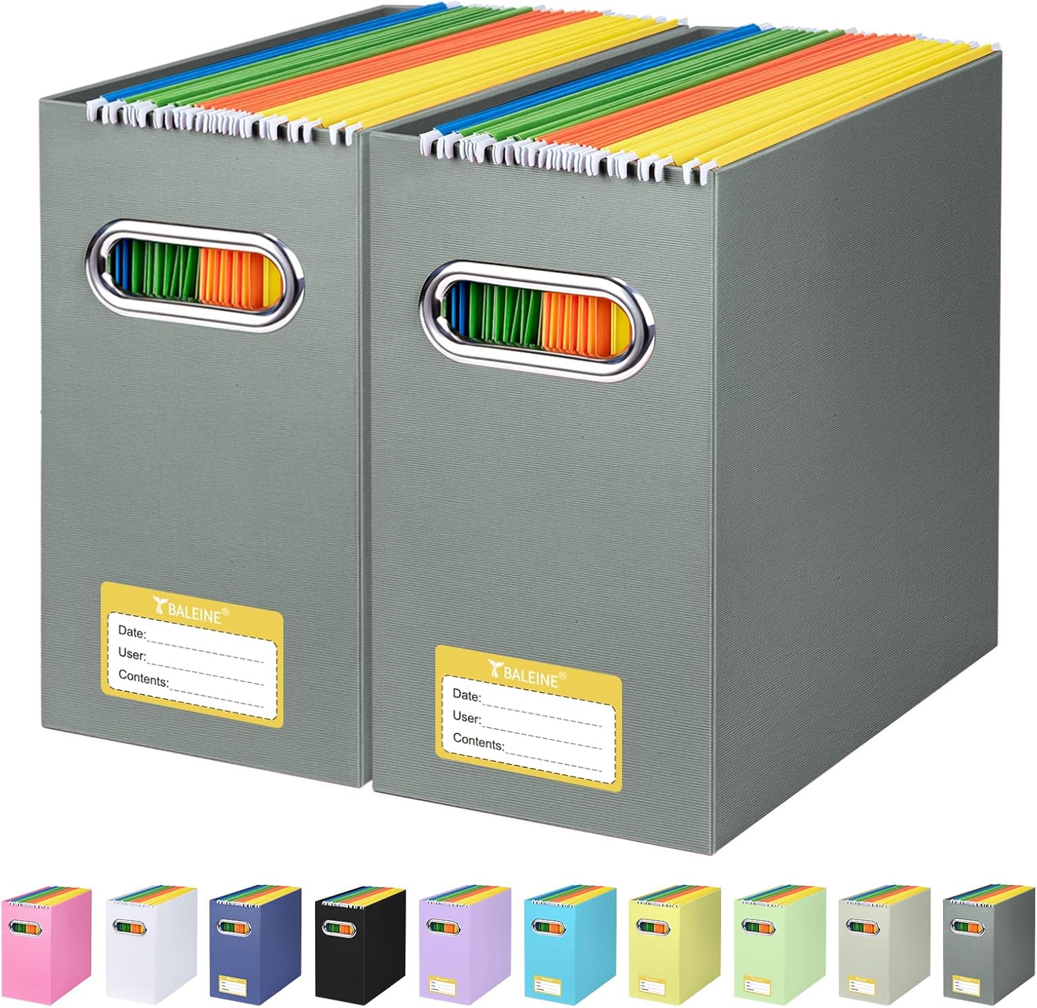 BALEINE File Organizer Box, Cardboard File Folder Organizer with Handle for Letter Size, Portable Collapsible Hanging Filing Box for Home Office Document Storage (2 Pack, Grey)