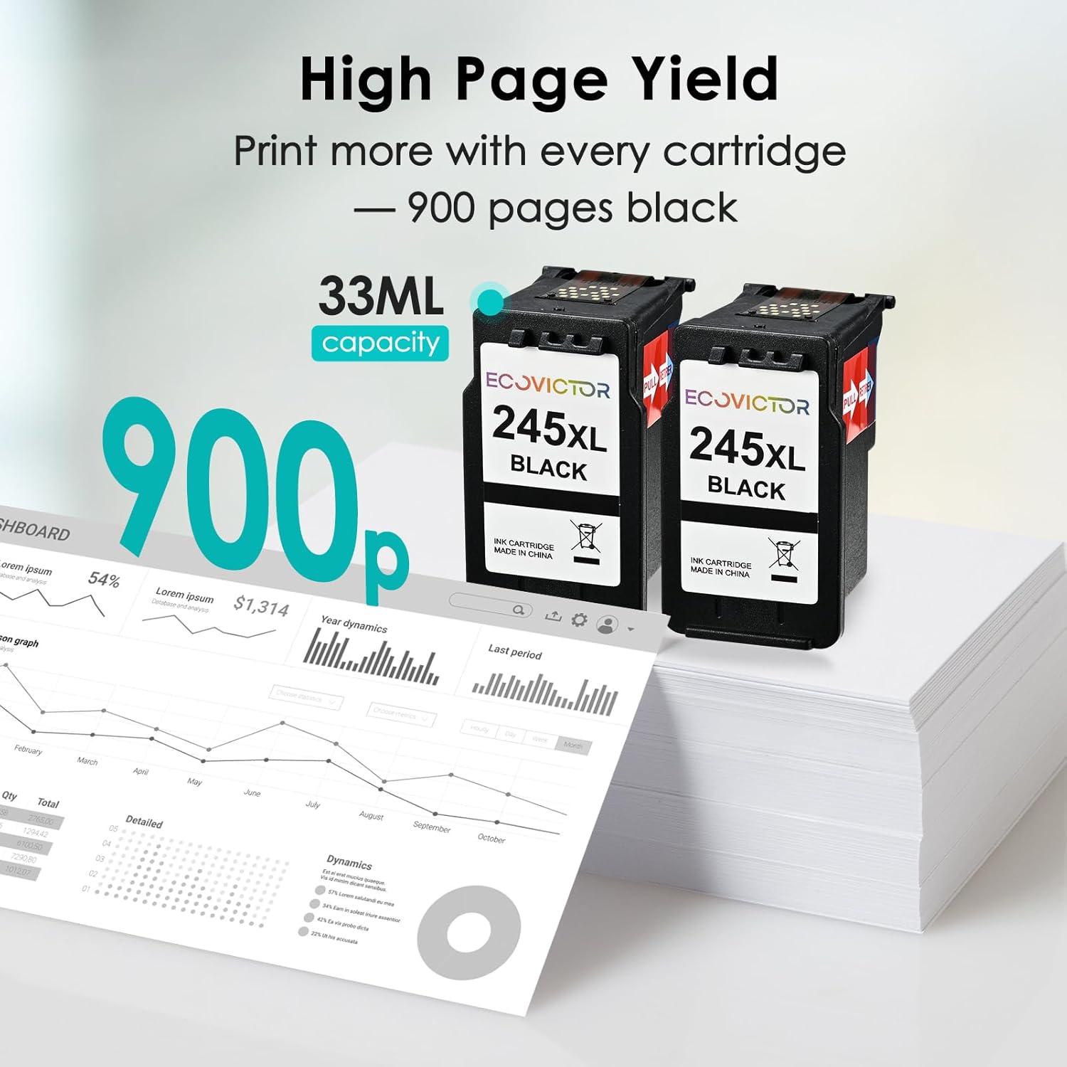- Long-Lasting Page Yield: EcoVictor 245 xl ink cartridges for canon 245xl black ink prints up to 450 pages each (at 5% coverage). EcoVictor for canon pg-245xl black ink cartridge is perfect for home, school, or office use. Enjoy long-lasting printing performance without the hassle of frequent replacements.