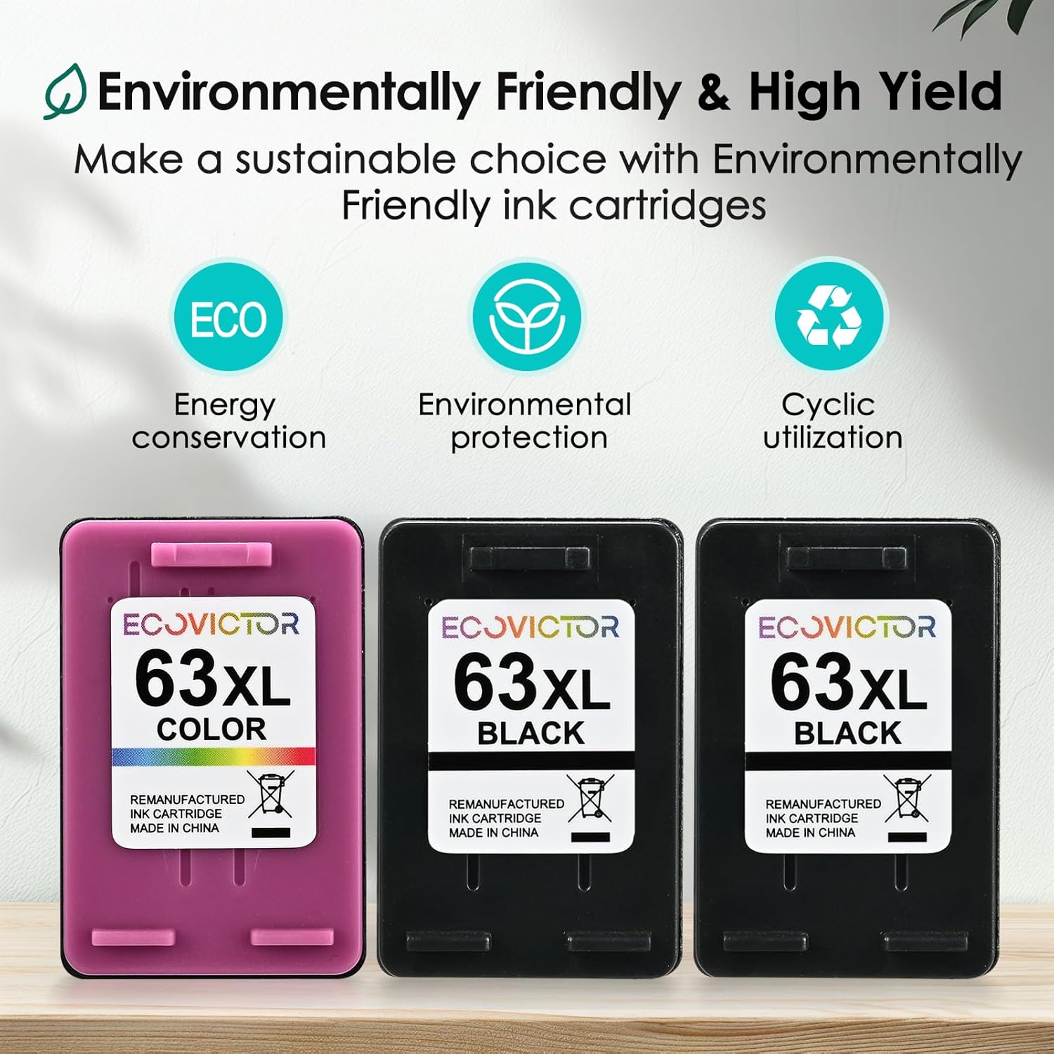 - Eco-Friendly & Certified: Made from durable, non-toxic materials, our remanufactured 63 xl ink cartridges replacement for hp 63xl ink cartridge combo pack is Climate Pledge Friendly certified, supporting sustainability while providing reliable performance. Print smarter and greener with EcoVictor 63 ink cartridges for hp printers.