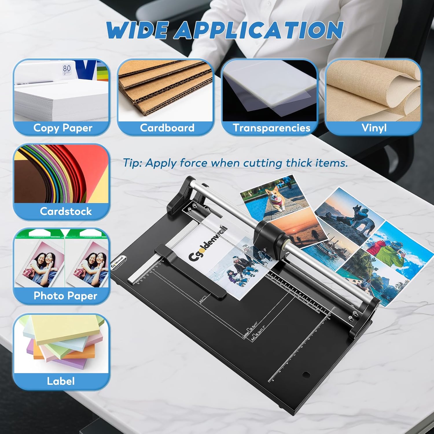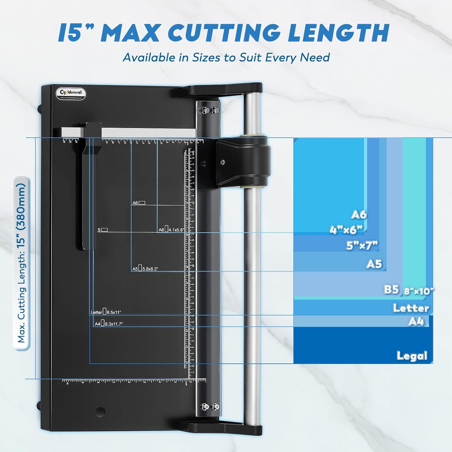 - 14.9" FOR VERSATILE USE: 14.9" cutting length, compatible with A6, 4"×6", 5"×7", A5, LTR, A4, Legal, and custom paper sizes. Effortlessly handle copy paper, cardstock, photo paper, cardboard, and thin films, etc.—perfect for offices, home DIY crafts, schools, and photo studios.