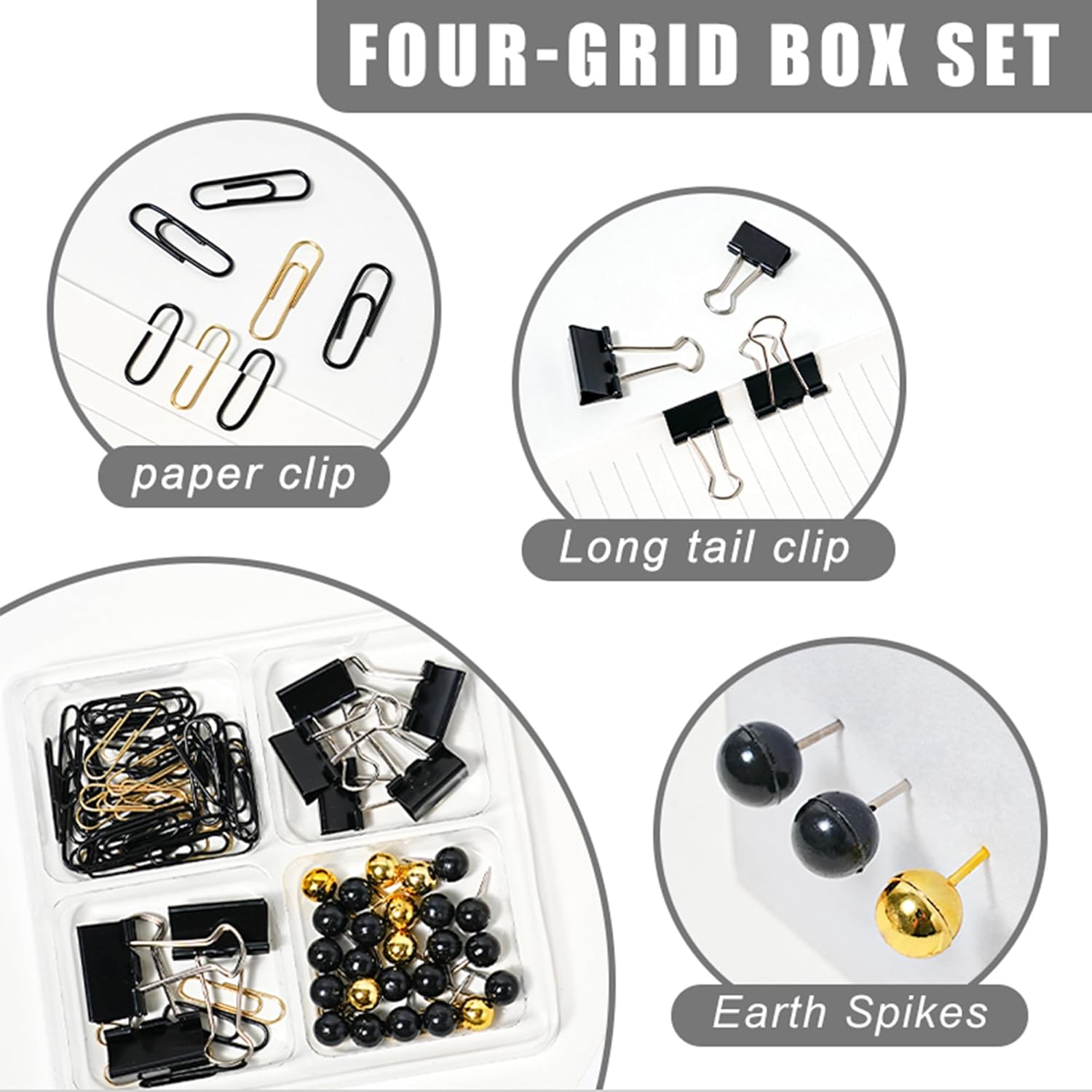 - COMPLETE SET: 10pcs office supplies, All-in-one includes 1 desk organizer for desk, 1 tape dispenser,1 tape, 1 stapler, 1 staple remover, 1 four-grid Clips Set (including 40 paper clips, 3 large binder clips, 5 small binder binders, 25 thumbtacks), 1000 staples, 1 ruler, 1 scissors and 1 pen for instant workspace setup