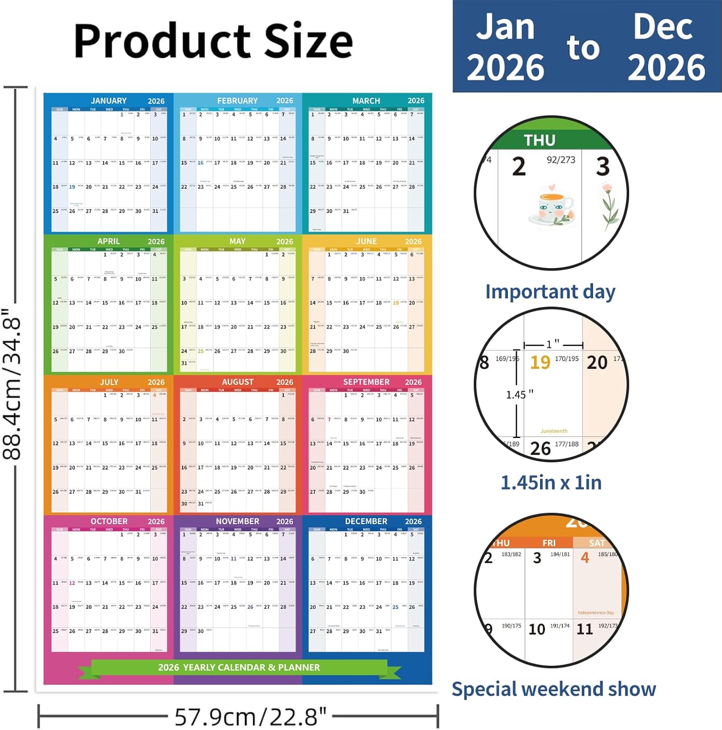 - Product size: The size of the calendar is 34.8" x 22.8" when fully expanded, and the daily blocks in each month are 1.45 x 1in.
