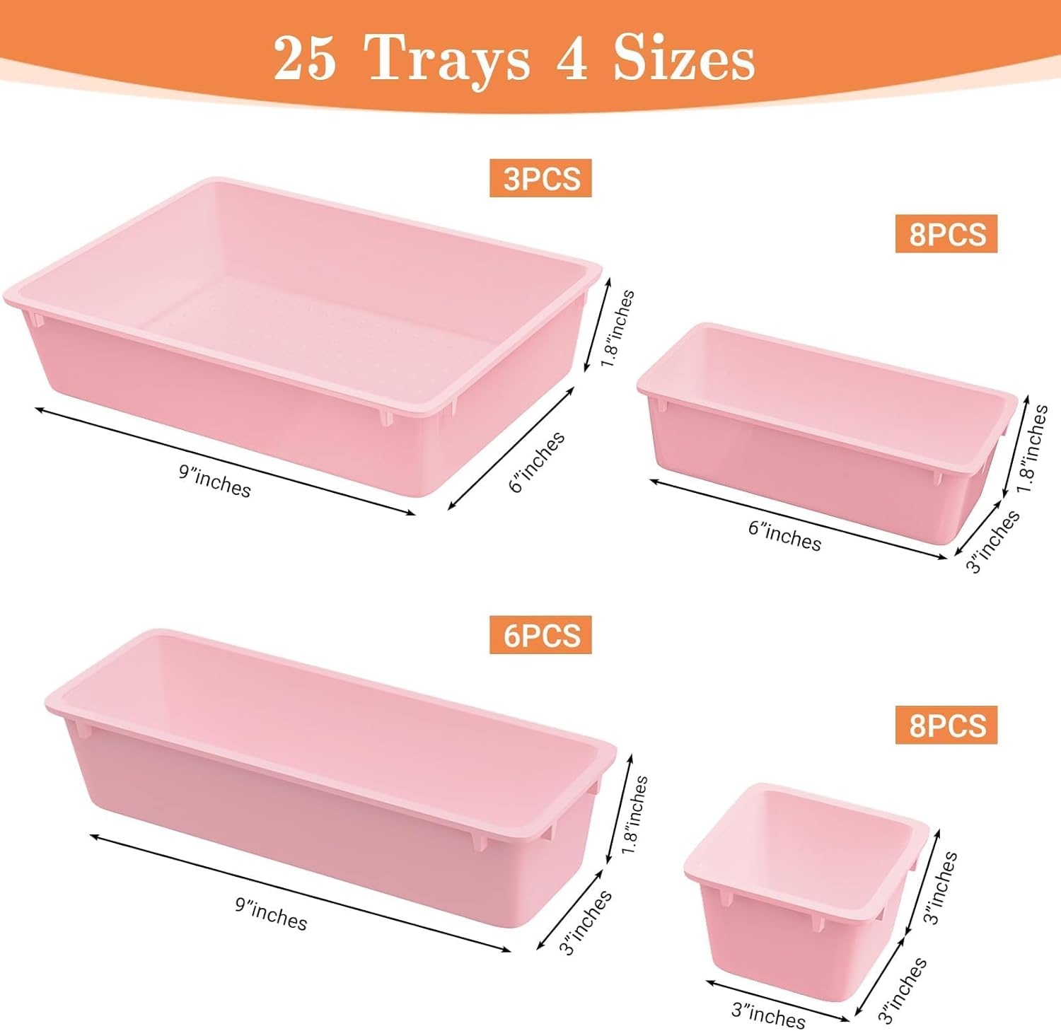 - 4 Different Combinations of Sizes: The drawer organizer includes 25 storage bins of 4 different sizes; includes: 9 x 6 x 1.8 inches (3 pcs), 9 x 3x 1.8 inches (6 pcs), 6 x 3 x 1.8 inches (8 pcs), 3 x 3 x1.8 inches (8 pcs)