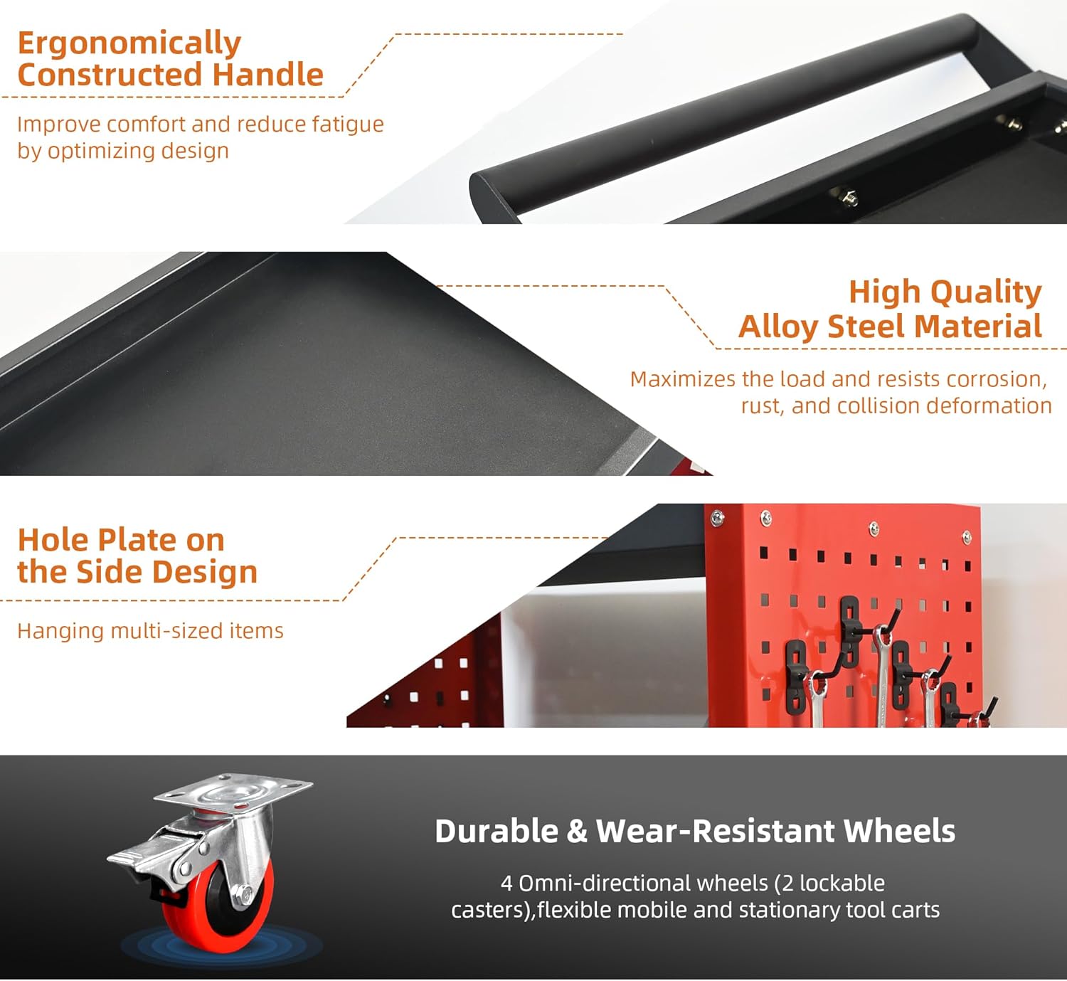 - Tool Cart on Wheels: Equipped with 4 flexible rotating casters (2 lockable) and the wide handle makes it easier to move the tool cart, you can move the rolling utility cart to any place without effort. The brake system makes this it convenient for you to stop the rolling tool cart as needed