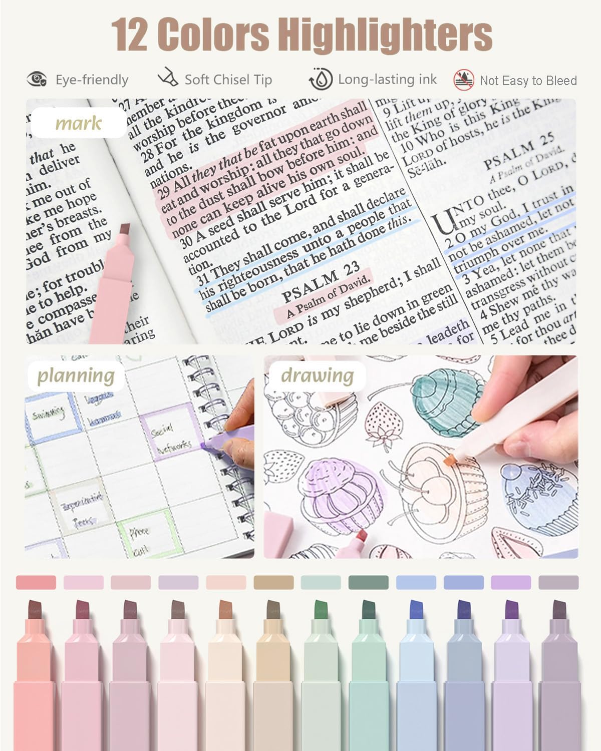 - 12 Assorted Colors Highlighters: Ideal for book annotation and Bible marking, these neutral yet vibrant markers feature a chisel tip for both fine and bold strokes; The gentle, long-lasting ink resists bleeding to keep pages clean and crisp