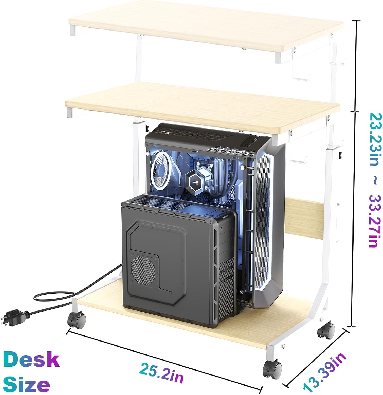 Height Adjustable Computer Tower Stand with Charge Station and USB Charging Port, 2-Tier ATX-Case Cart, Under Desk Mobile PC Stand, CPU Holder Cart with Locking Caster Wheels for Fits Most PC
