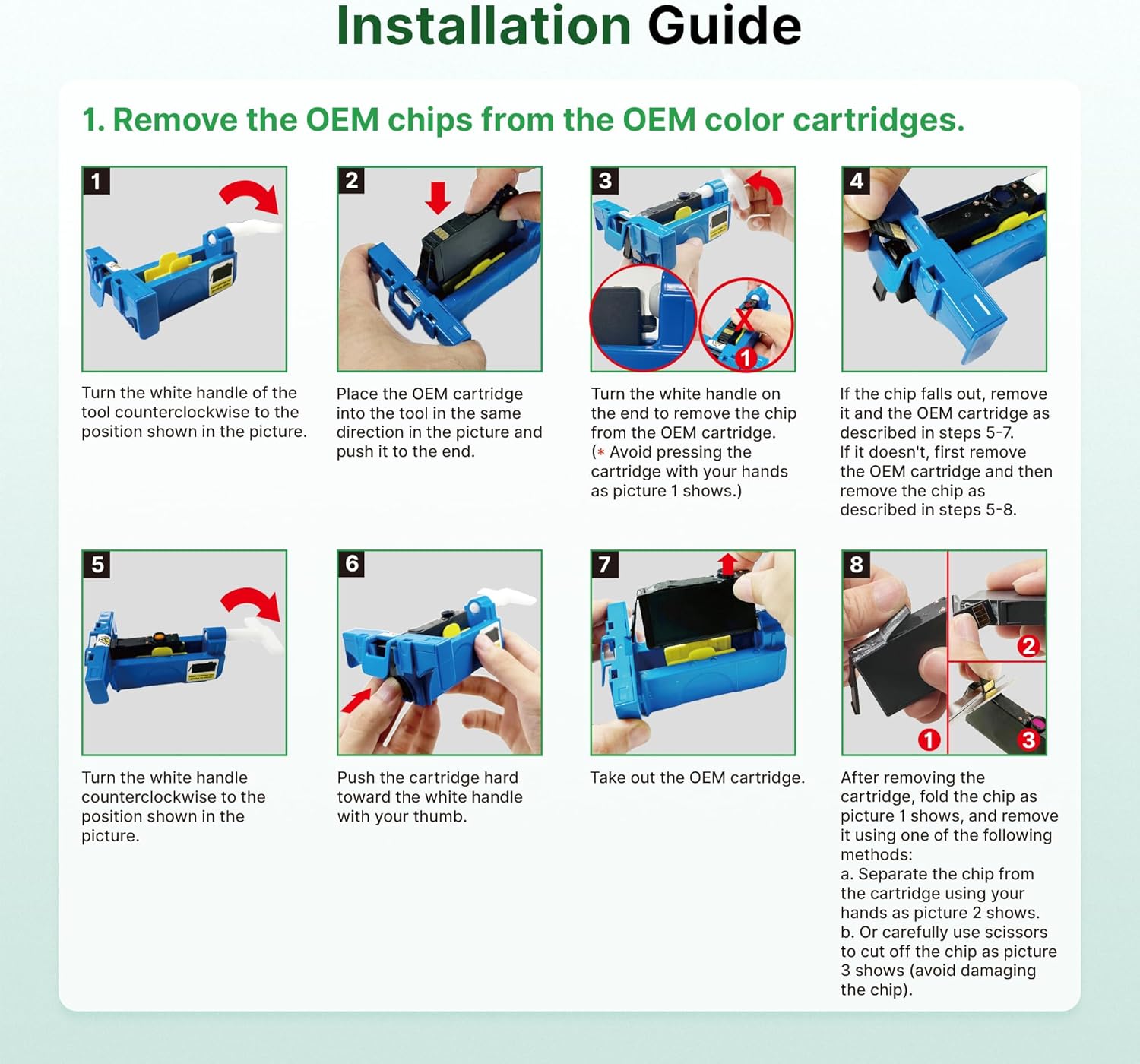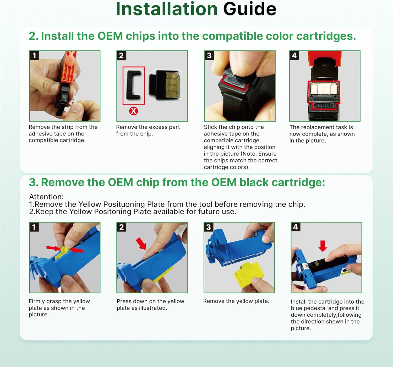 - Chip Replacement Guide: ①You need to remove the original chips on ink cartridges through our tool. ②Peel off the tape of the new compatible cartridge and Stick the chip onto the tape