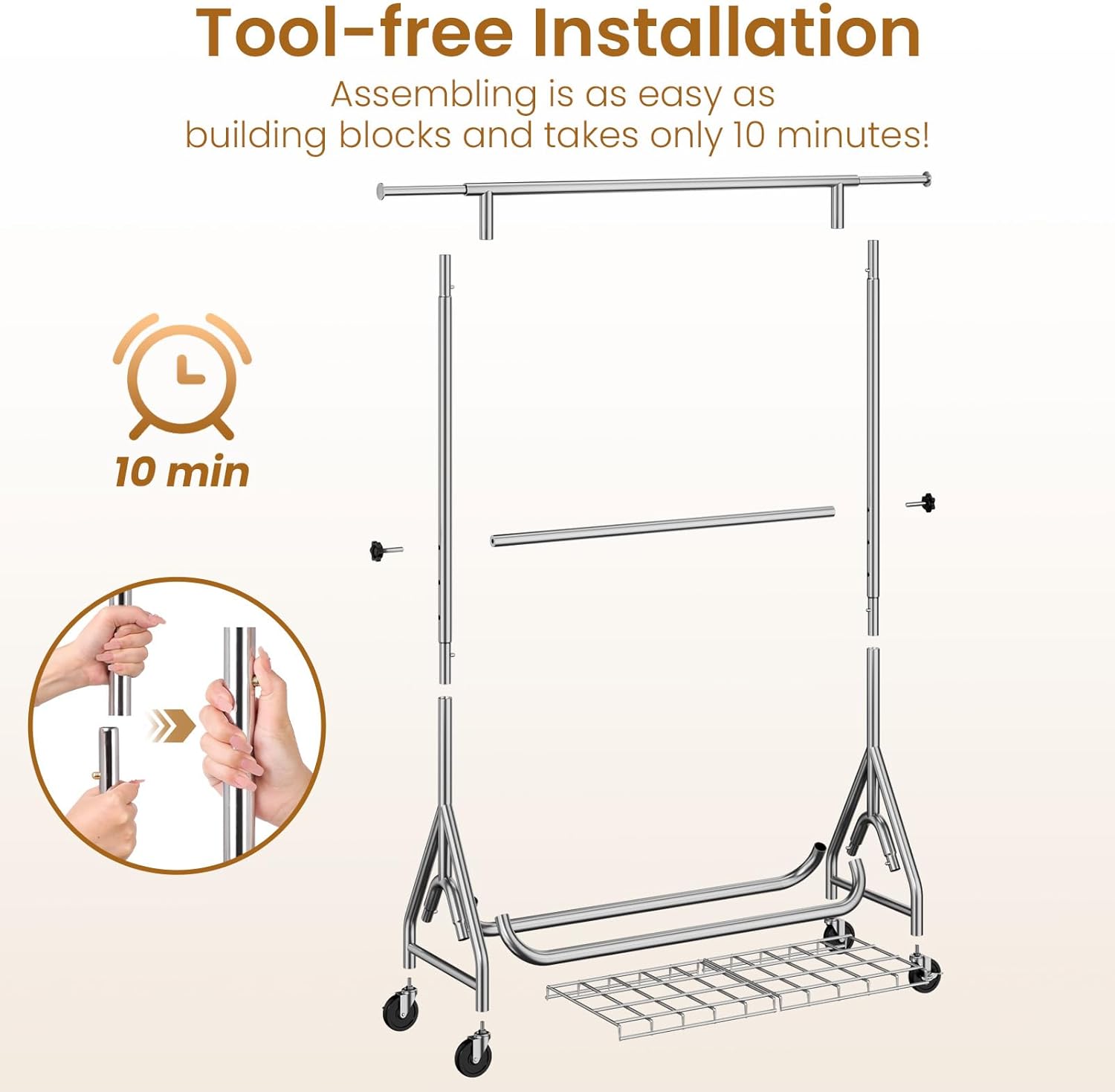 - 𝙀𝘼𝙎𝙔 𝙏𝙊 𝘼𝙎𝙎𝙀𝙈𝘽𝙇𝙀: The hanging clothes rack has been carefully designed with simple components, no need to worry about missing parts and tools. Secondary installation or disassembly can be done in 1 minute without tools, perfect for yard sales, seasonal storage, making assembling metal clothes rack easy and simple, saving you a lot of time. You can assemble our rolling racks with the help of the instructions or refer to our installation video.
