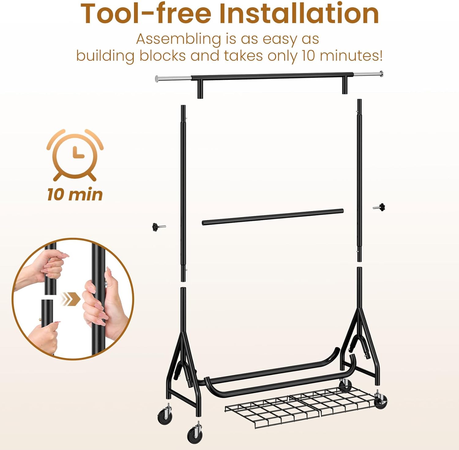 - 𝙀𝘼𝙎𝙔 𝙏𝙊 𝘼𝙎𝙎𝙀𝙈𝘽𝙇𝙀: The hanging clothes rack has been carefully designed with simple components, no need to worry about missing parts and tools. Secondary installation or disassembly can be done in 1 minute without tools, perfect for yard sales, seasonal storage, making assembling metal clothes rack easy and simple, saving you a lot of time. You can assemble our rolling racks with the help of the instructions or refer to our installation video.