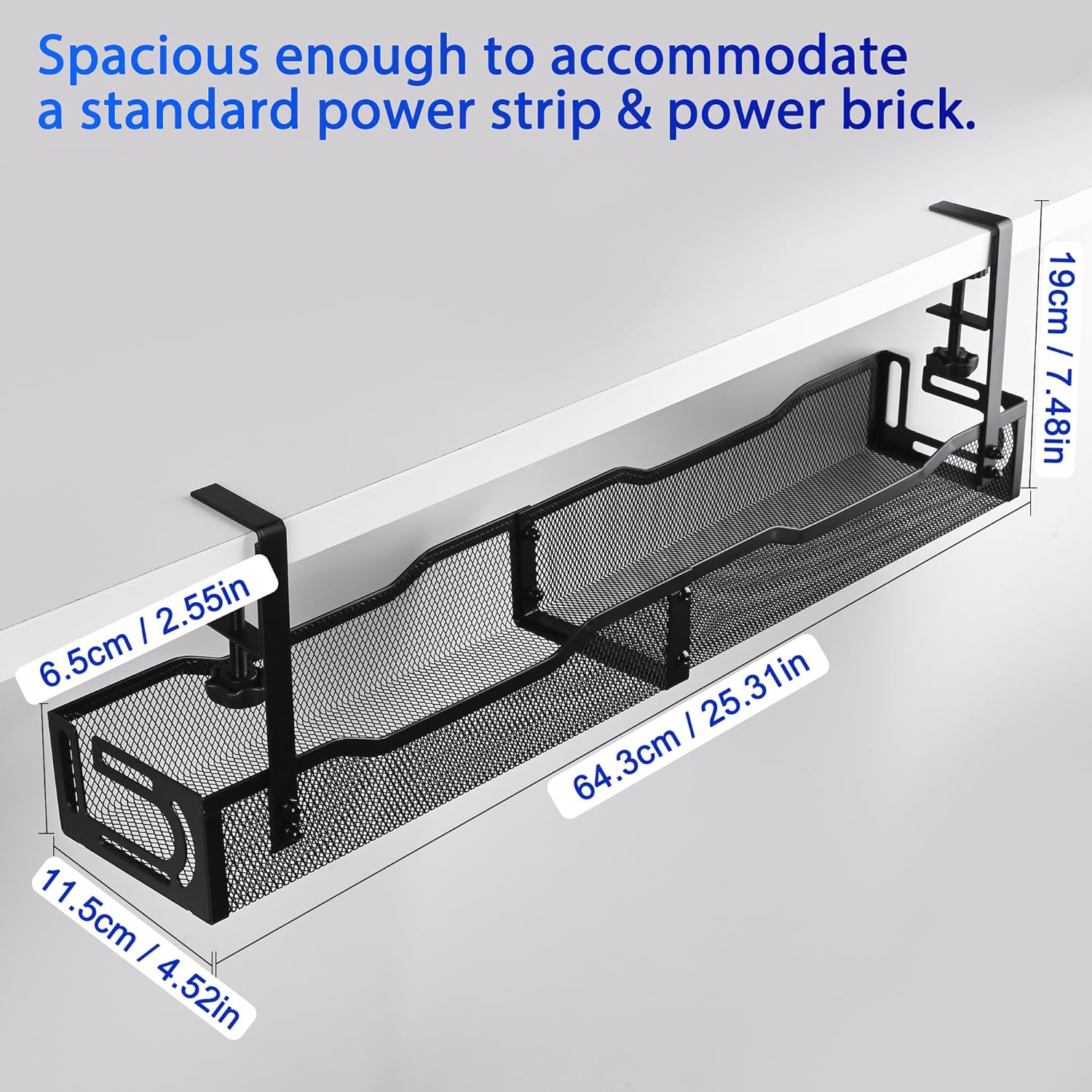 - All-in-One 25.3 Inch Under Desk Cable Management System - This 25.3 inch under desk cable management tray offers ample space to hide cords, power strips, surge protectors, and messy wires. Create a neat and safe workspace with maximum cable storage capacity.