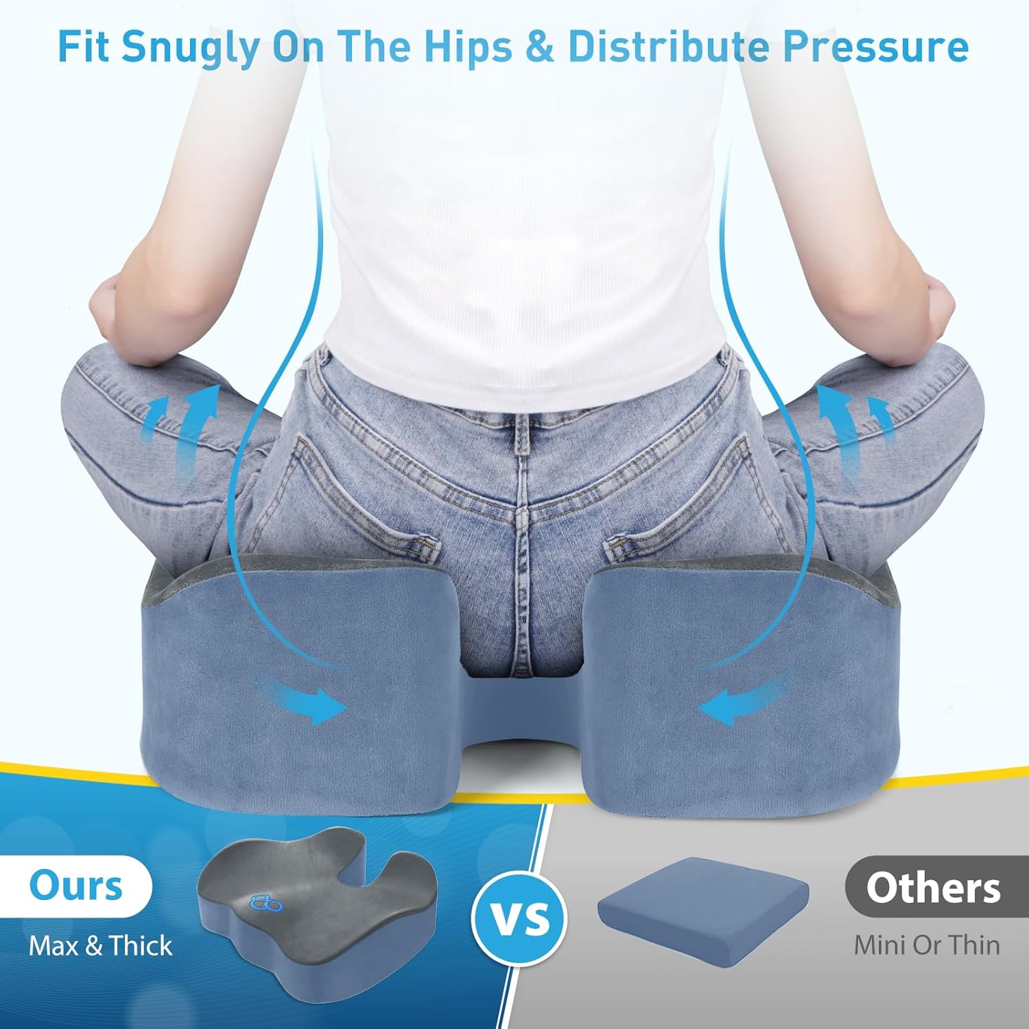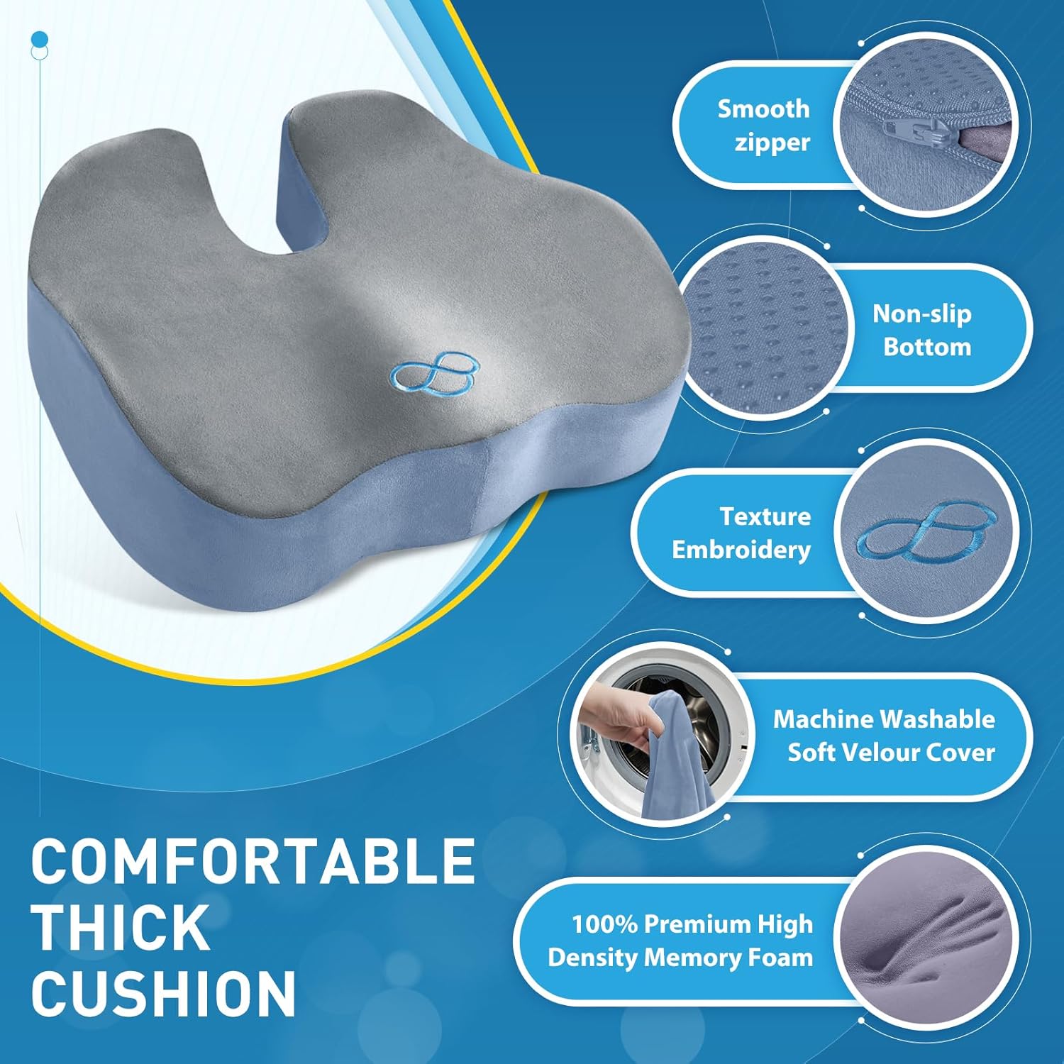 BlissTrends Seat Cushion,5.2in Thick Memory Foam Cushions for Office Chair, Car Seat, Airplane, Relieving Pressure Tailbone Sciatica Back Pain for Long Sitting Office Workers, Car Drivers Gery&Blue