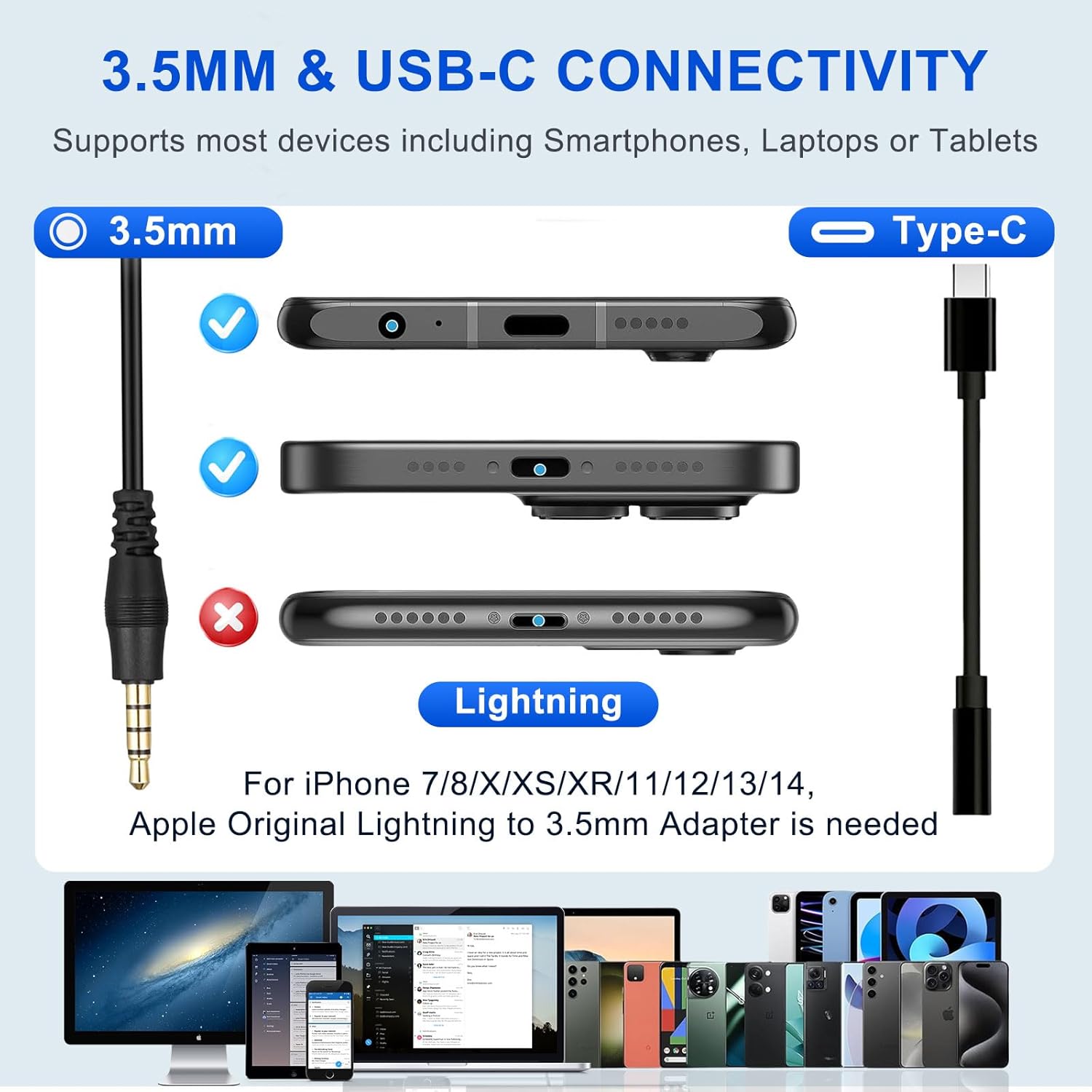- 【3.5mm Jack/TYPE-C Connection】This 3.5mm wired headset with microphone includes a USB Type C to 3.5mm Headset Jack Adapter. Compatible with PC, Tablet, Mac, Laptop, iPhone Android Cell Phone, providing seamless connectivity with both 3.5mm and USB-C Jack. Friendly Note: For iPhone 7/8/X/XS/XR/11/12/13/14, Apple Original Lightning to 3.5mm Adapter is needed (Supplied by Apple).