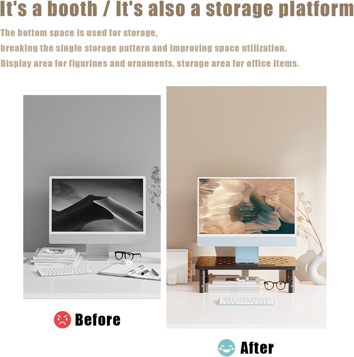 - 4: The sleek modern black design complements,The monitor stand tabletop can display statues and decorations any desk while adding extra space underneath the stand for storage