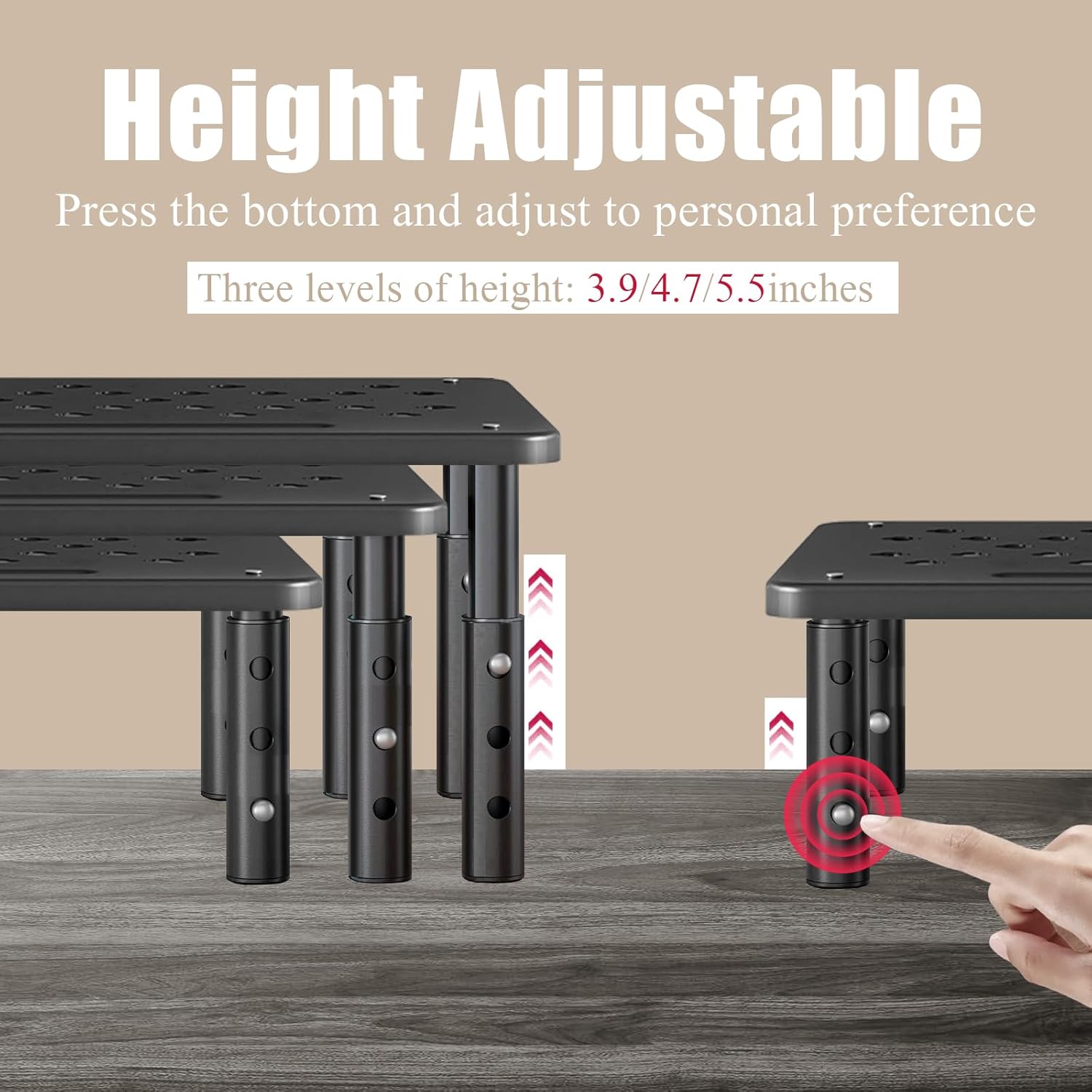 - 2: Three levels of height can be adjusted,can raise a computer monitor, notebook, or any device by 3.9 inches, 4.7 inches, or 5.5 inches off the desk to create a comfortable viewing and sitting position which helps reduce stress on the neck and back