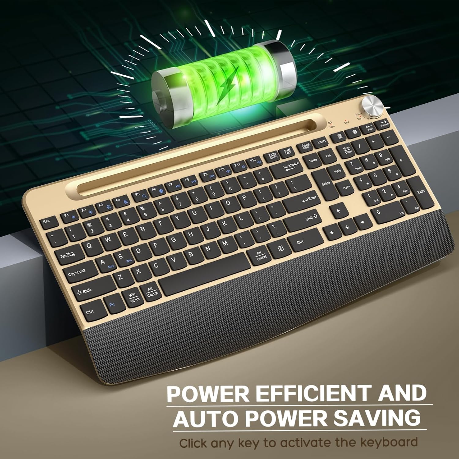- 【Ergonomic Keyboard with Wrist Rest】 The gold wireless keyboard mouse combo has a comfortable touch and typing feel, and the gold ergonomic wireless keyboard design with palm rest and folding holder, every detail is carefully crafted to fit your hand fully. Ergonomic wireless mouse is designed to fit the natural contours of the hand, reducing stress on the wrist and hand muscles.