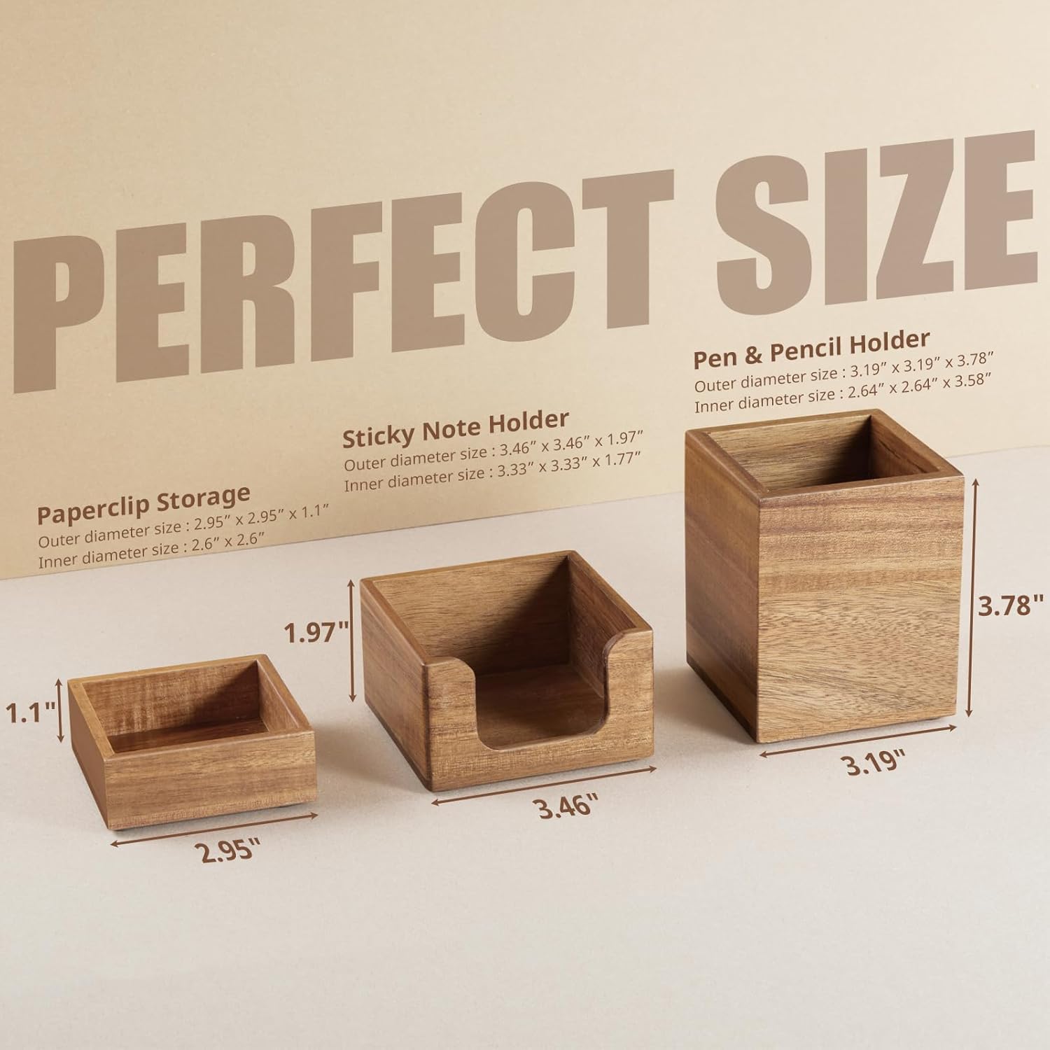 Desk Organizer Set of 3 - Acacia Wood Office Desk Accessories - Desk Organizers and Accessories for Women Men - Set incl. Pencil Pen Holder, Paperclip Storage and Sticky Note Holder