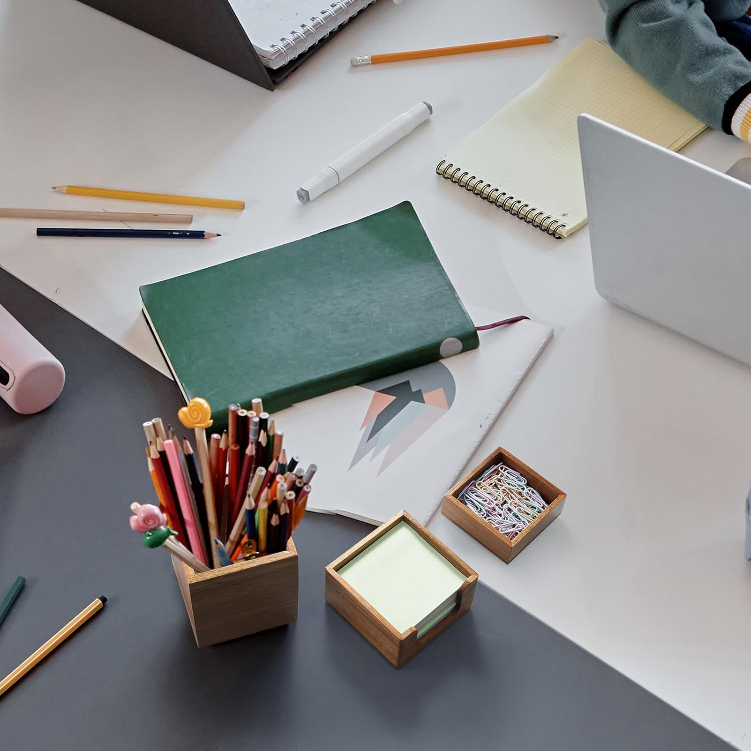 - Stay Organized & Inspired: Desk organizer set including a 3.19"x3.19"x3.78" pen holder, a 3.46"x3.46"x1.97”sticky note holder and a 2.95"x2.95"x1.1" metal clip holder is designed to help you create an inviting space where you can thrive, innovate, and stay inspired throughout the day.