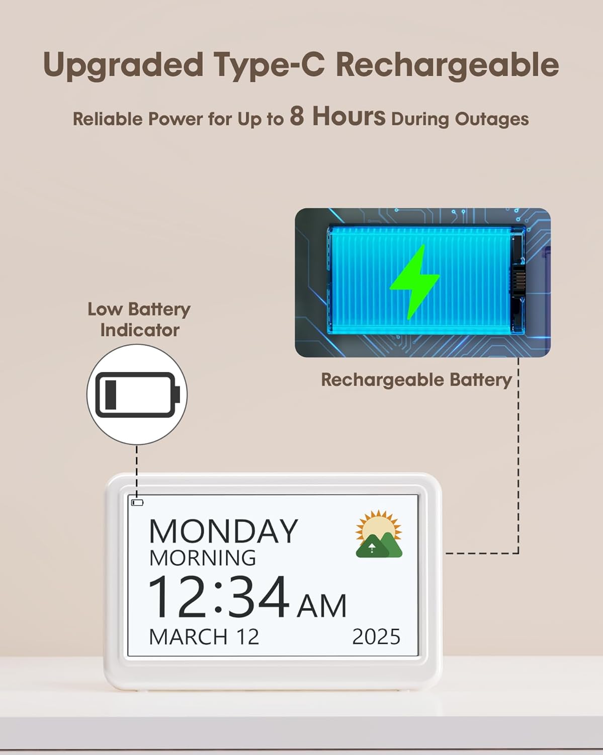 - 【Two Power Mode】Runs on built-in rechargeable battery for 8 hours of runtime or via a USB-C cable (adapter not included) for continuous power. If you want to keep the screen always on, it must work with 5V/1A power adapter (no included) and USB-C cable cord (included). Built-in 2200mAh battery is specifically designed for power outage scenarios, supporting 8 hours of emergency operation.