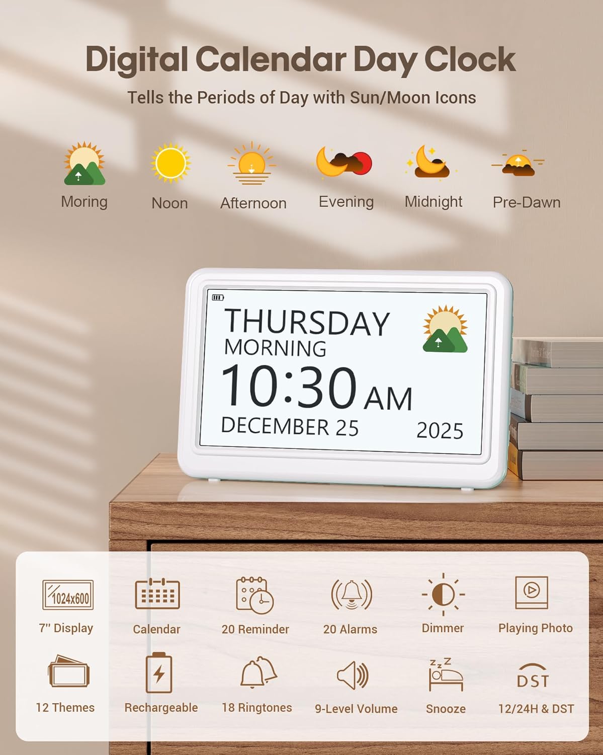 - 【HD Display & Larg Font】The 𝗰𝗹𝗼𝗰𝗸 𝘄𝗶𝘁𝗵 𝗱𝗮𝘁𝗲 𝗮𝗻𝗱 𝘁𝗶𝗺𝗲 𝗳𝗼𝗿 𝗲𝗹𝗱𝗲𝗿𝗹𝘆 features a 7-inch 1024x600P HD LCD display that clearly displays the TIME, DATE, DAY of the WEEK, six time periods of the day[ MORNING, NOON, AFTERNOON, EVENING, NIGHT, MIDNIGHT, BEFORE DAWN ], and displays the ICONS of each time period in a bright Sun🌞 Moon🌙 visuals, ensuring that elderly individuals can easily understand the time and date.
