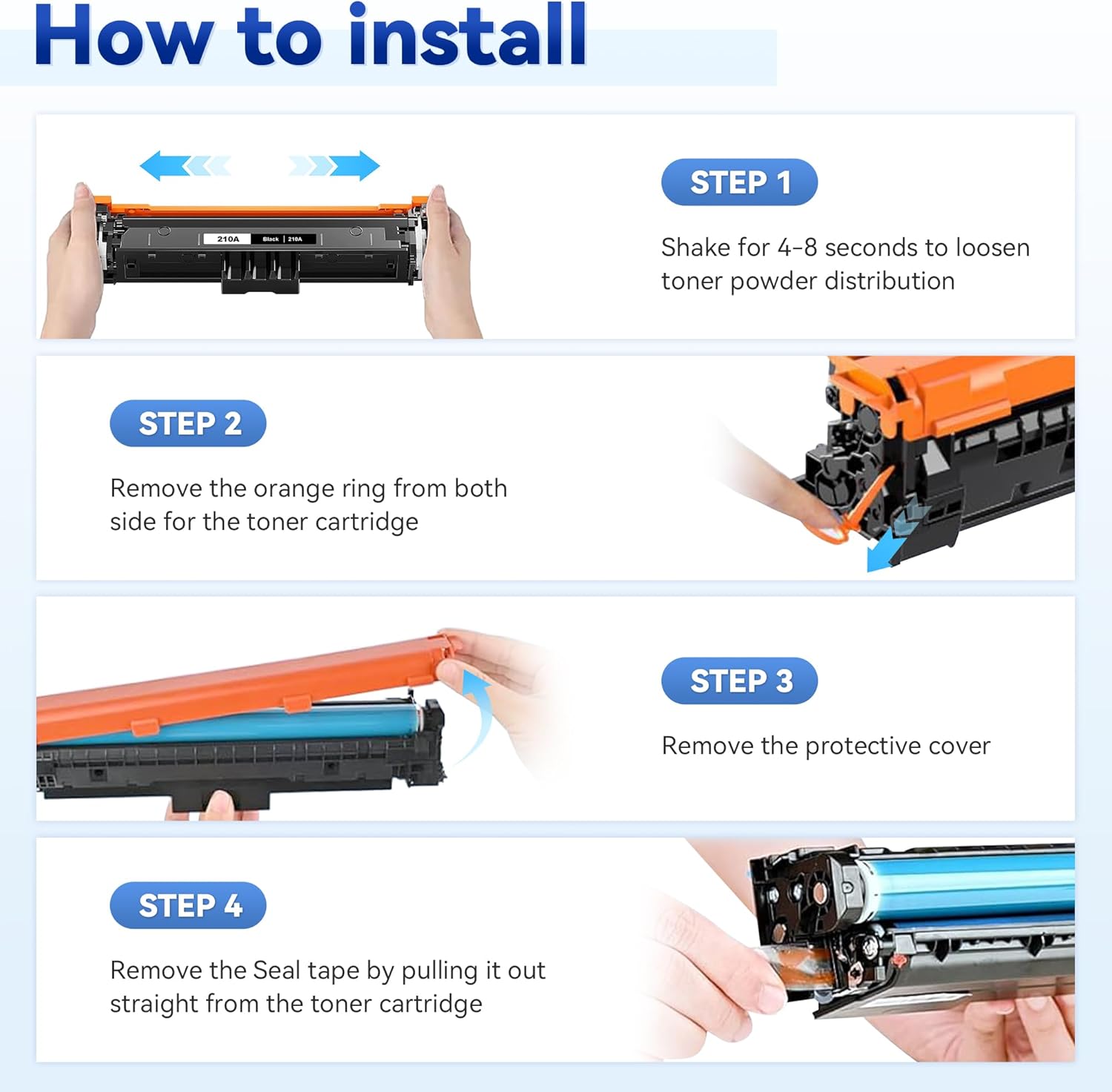 - Package Contents: 4-Pack 210A W2100A Toner Cartridge with chip. Compatible with HP 210A 210X Toner Cartridges. Color: Black/Cyan/Magenta/Yellow